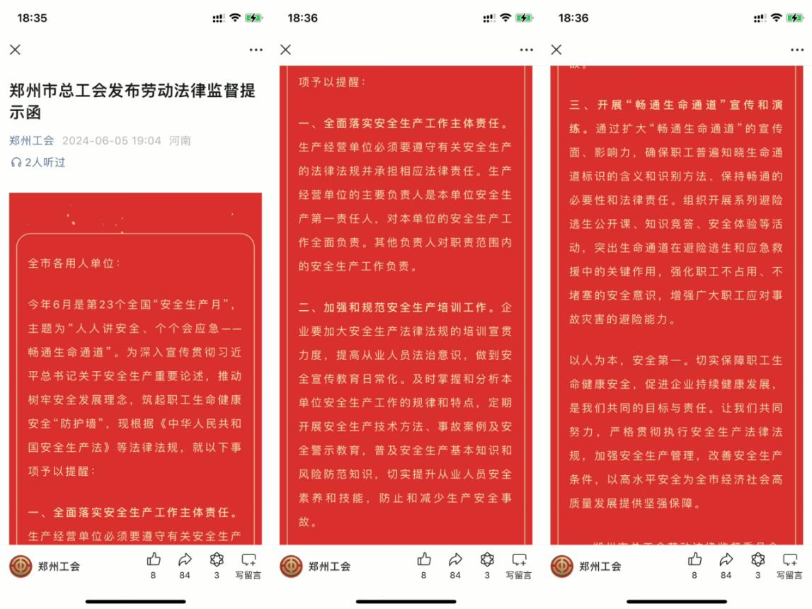 “全面落实安全生产工作主体责任”“加强和规范安全生产培训工作”“开展‘畅通生命通道’宣传和演练”……6月5日,郑州市总工会根据安全生产法等法律法规,在全省率先发布劳动法律监督提示函,就安全生产相关事项向全市各用人单位予以提醒。