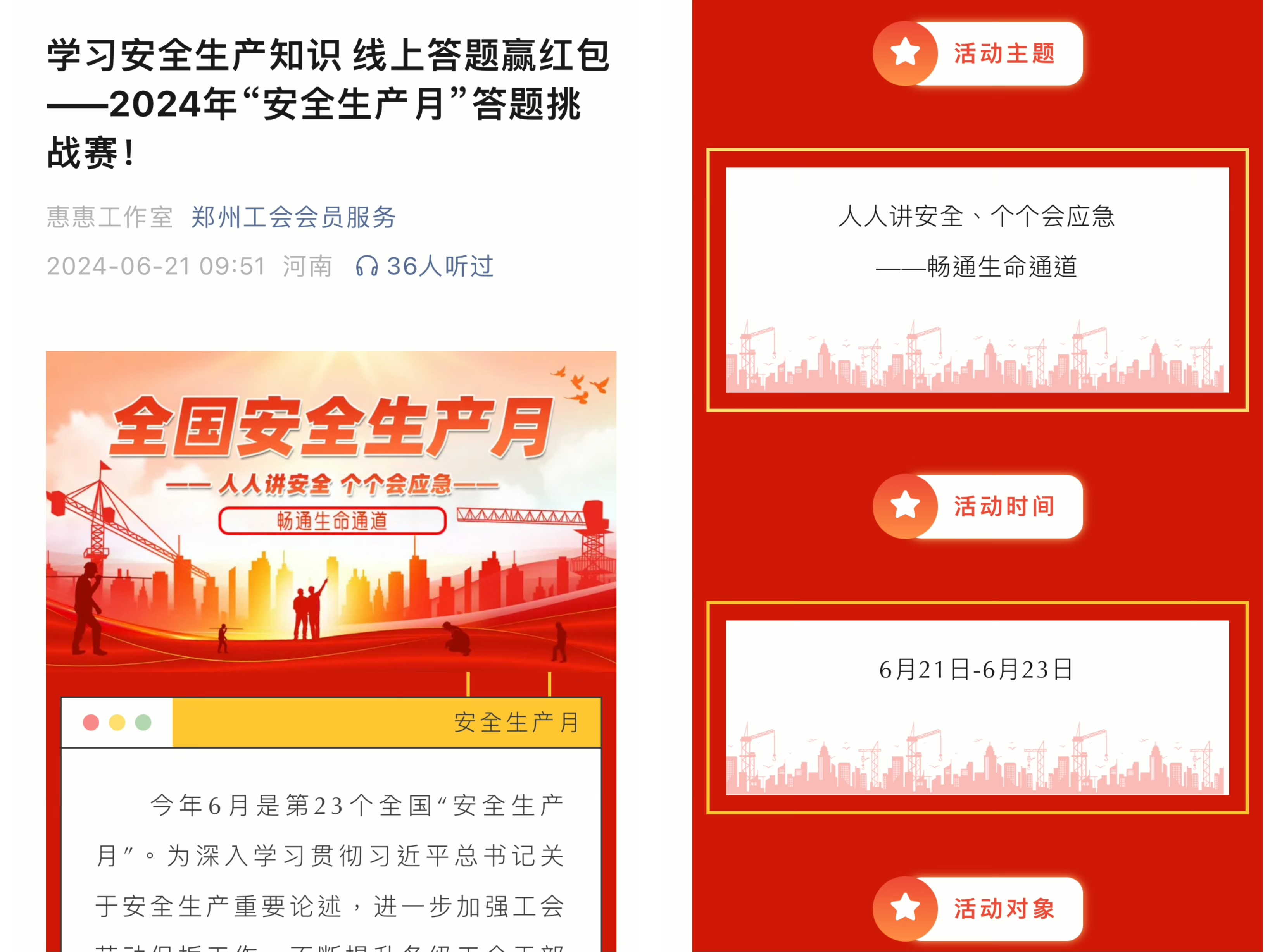 今年6月是第23个全国“安全生产月”,主题为“人人讲安全、个个会应急——畅通安全生命通道”。为深入贯彻习近平总书记关于安全生产重要指示精神,积极营造共建共治共享安全的良好氛围,郑州市总工会线上线下齐联动,开展了一系列“安全生产月”法治宣传活动,把安全生产知识实实在在地送到职工群众身边。