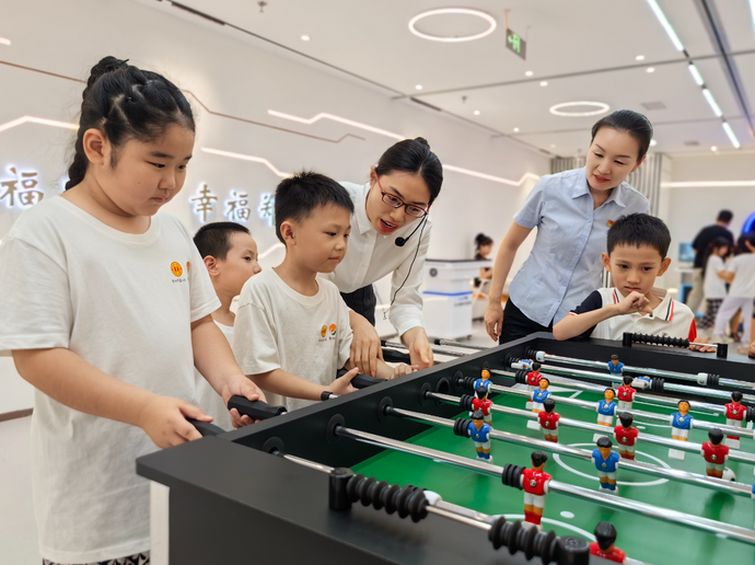 “老师,我们在这里,你看我们笑得多好看!”托管班年龄最小的张思小朋友指着笑脸墙上他和老师的合影欢快地蹦着笑着。“老师,我们又进球了,五比一,耶!”李怡涵和队友又进了一个球,她笑着向老师汇报“战绩”,孩子们很快就找到了自己喜欢的项目,在体验中收获满满。