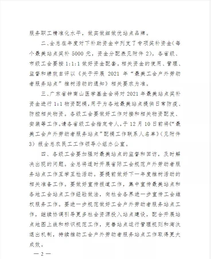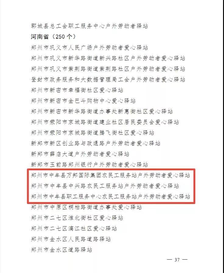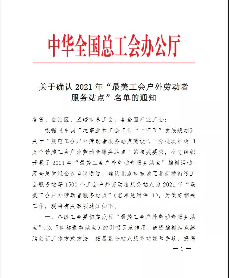 近日,中牟县总工会农民工服务站传来喜讯。2021年12月1日,中华全国总工会办公厅下发了《关于确认2021年“全国最美工会户外劳动者服务站点”名单的通知》,通知中明确中牟县总工会设立的3家农民工服务站(职工服务中心农民工服务站、中牟县中兴路农民工服务站、中牟县万邦国际集团农民工服务站)被中华全国总工会评选为全国“最美工会户外劳动者服务站点”荣誉称号。按照通知内容,获得该荣誉称号的每个服务站点将获得专项奖补资金5000元;各省、市级工会按照1:1:1资金配套;广东省钟南山医学基金会对每个服务站点奖补资金进行1:1物资配捐,用于服务站日常防疫、防控工作。