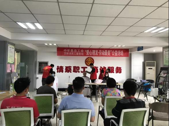 图四 万邦农民工服务站为户外劳动者开展每月“爱心理发”活动