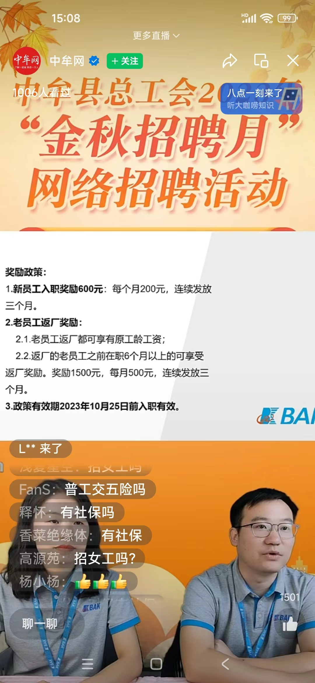 此次专场招聘,涉及普工、技工、维修工、机电工程师、生产主管、SQE工程师等工种,提供就业岗位238个。直播期间针对参与互动人员询问企业岗位信息,薪资待遇、五险一金、工作时长、餐饮住宿等问题,用人单位的两位工作人员耐心解答,对有就业需求的,明确求职路径,开展针对性岗位推荐。网络直播间招聘气氛火热,观看人数近3000人,线上参与互动及电话咨询人数600余人,网络招聘会当天接收简历投递100余份。