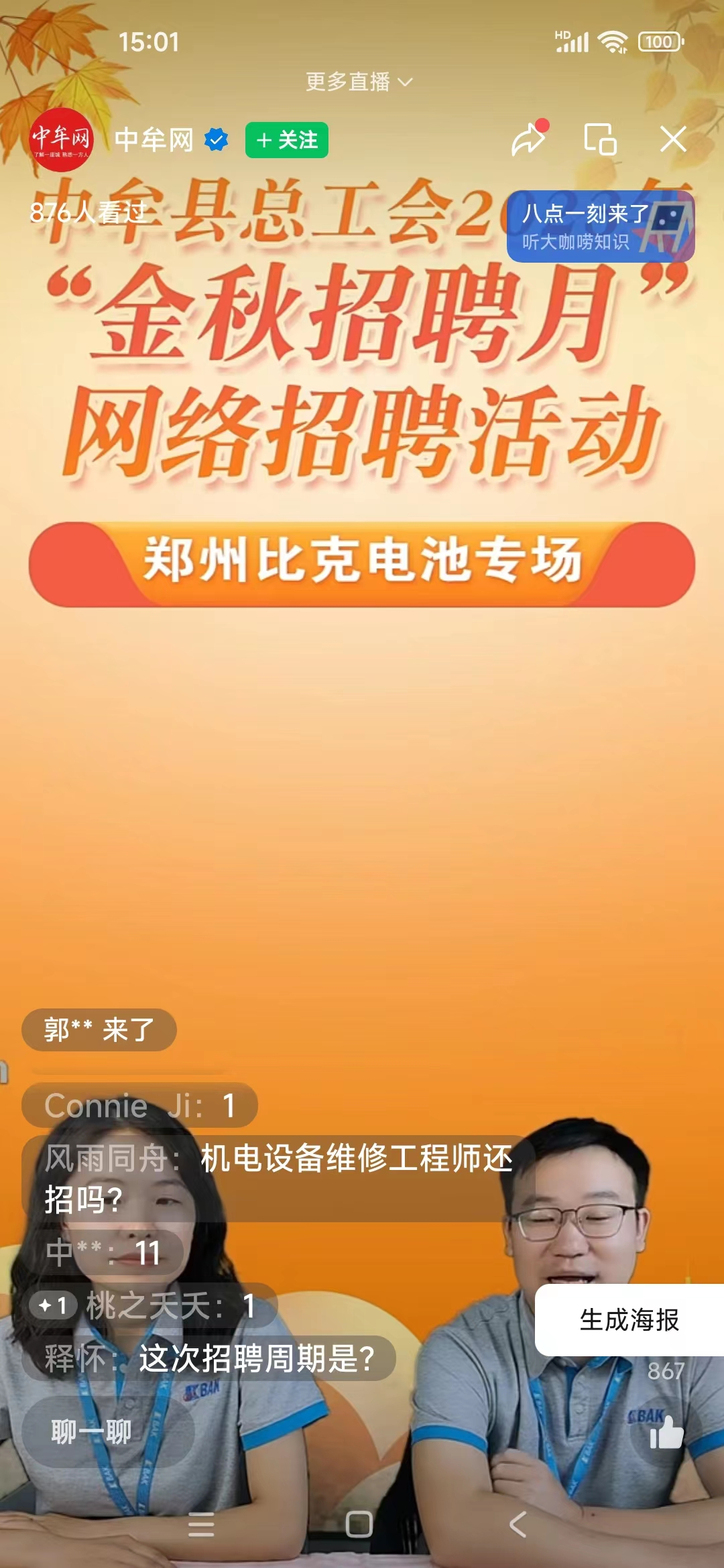 根据省、市总工会关于稳就业、保就业工作要求,为促进劳动力市场繁荣和人力资源供需匹配对接,积极发挥工会组织助力企业招工稳岗作用。10月19日下午,中牟县总工会联合中牟龙端网络科技有限公司开展2023年“金秋招聘月”暨郑州比克电池专场网络招聘会。