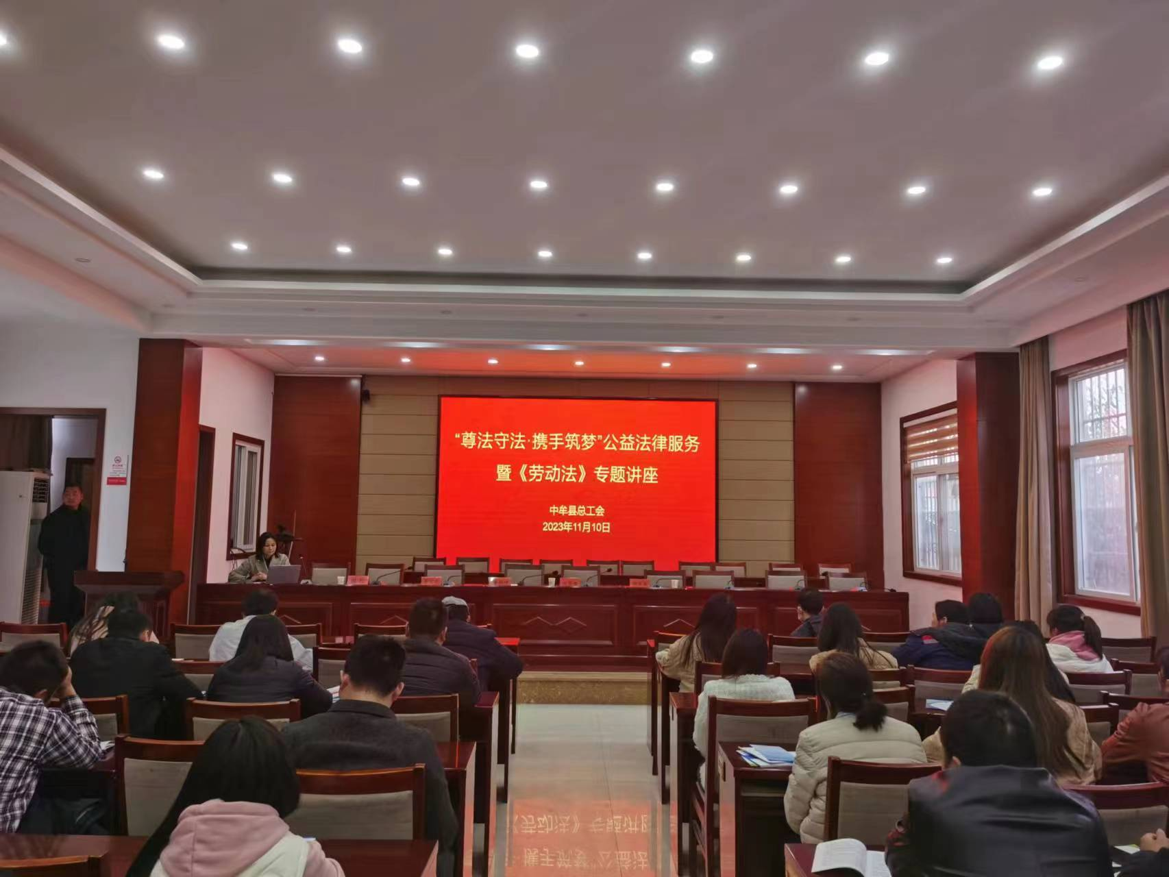 11月10日下午,中牟县总工会联合县人社局在姚集镇会议室举办“尊法守法·携手筑梦”公益法律服务暨《劳动法》专题讲座,来自姚集镇辖区的120余名企业负责人和职工代表聆听了讲座。