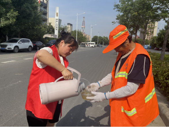 活动中,驿站工作人员带着精心熬制的绿豆汤和清凉物资,向辛勤工作的环卫工人送去夏日福利和诚挚的问候,再三叮嘱他们夏季高温天气一定要时刻注意身体状况,做好防暑降温工作。同时感谢他们用勤劳的双手为辖区营造了整洁、舒适的环境,让顶着酷暑忙碌在街头巷尾的他们实实在在感受到了夏日的一丝清凉。环卫工人手里拿着绿豆汤,脸上露出了灿烂笑容,心里也是备感凉爽。