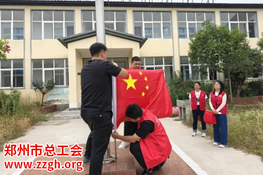 在沙坡池村党群服务中心,县总工会与结对村的党员干部一起升起国旗,共同庆祝新中国75岁华诞。