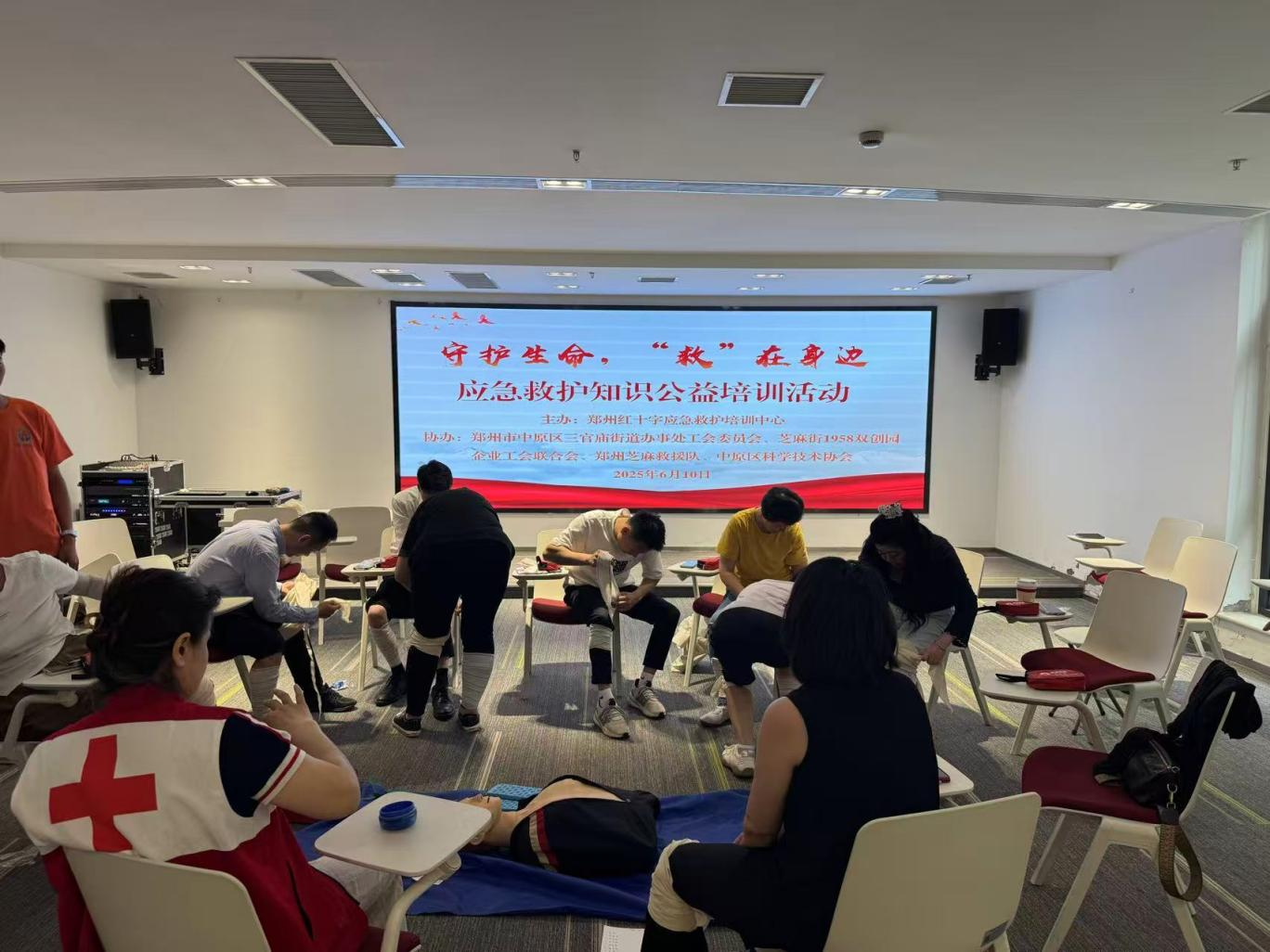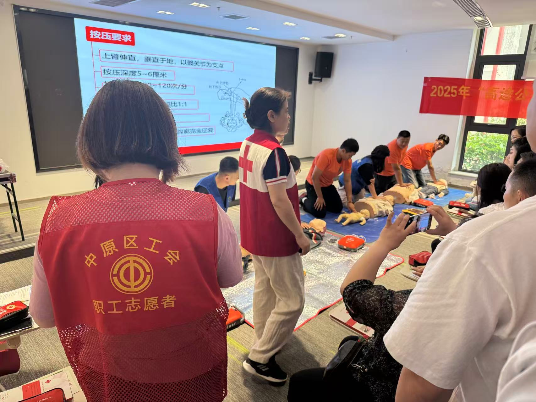 为深入贯彻落实"健康中国"战略,强化基层职工应急处置能力,增强安全防范意识,6月10日,郑州市中原区三官庙街道办事处工会委员会联合郑州红十字应急救护培训中心、芝麻街1958双创园企业工会联合会、郑州芝麻救援队组织开展应急救护知识培训活动,此次活动聚焦"黄金四分钟"救援时效,通过系统化教学帮助职工掌握专业救护技能,街道及园区60余名职工参与学习。