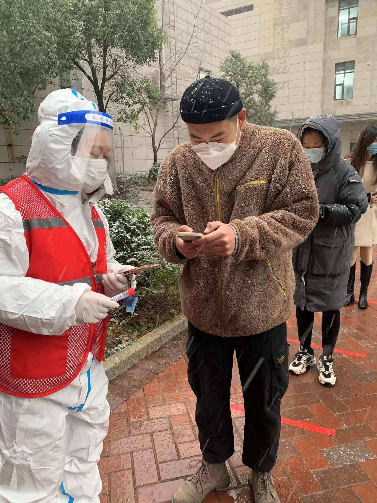 1月4日清晨,郑州市新冠肺炎疫情防控指挥部办公室发布2022年1号通告,为切实保障居民群众生命安全和身体健康,快速有效阻断扩散,二七区淮河路街道工会、大学路街道工会、建中街街道工会等第一时间组织“红马甲”迅速在区域内助力核酸检测工作并严格按照要求规范区域内进出情况。在核酸检测现场,“红马甲”顶着风雪各自忙碌在自己的工作岗位上,“您好,请带好口罩,保持一米距离”“请出示核酸检测二维码”….“红马甲”们不厌其烦的提示着前来的群众。很多前来检测的居民也对“红马甲”表达了钦佩和赞扬,排队的居民打着冷颤说道:“在做核酸的时候没想到能看到2022年的第一场雪,这么冷的天,工作人员和医护人员在工作岗位上这么辛苦,我们排一会儿队就冻的直跺脚,非常感谢他们总在疫情第一时刻守护着我们”。