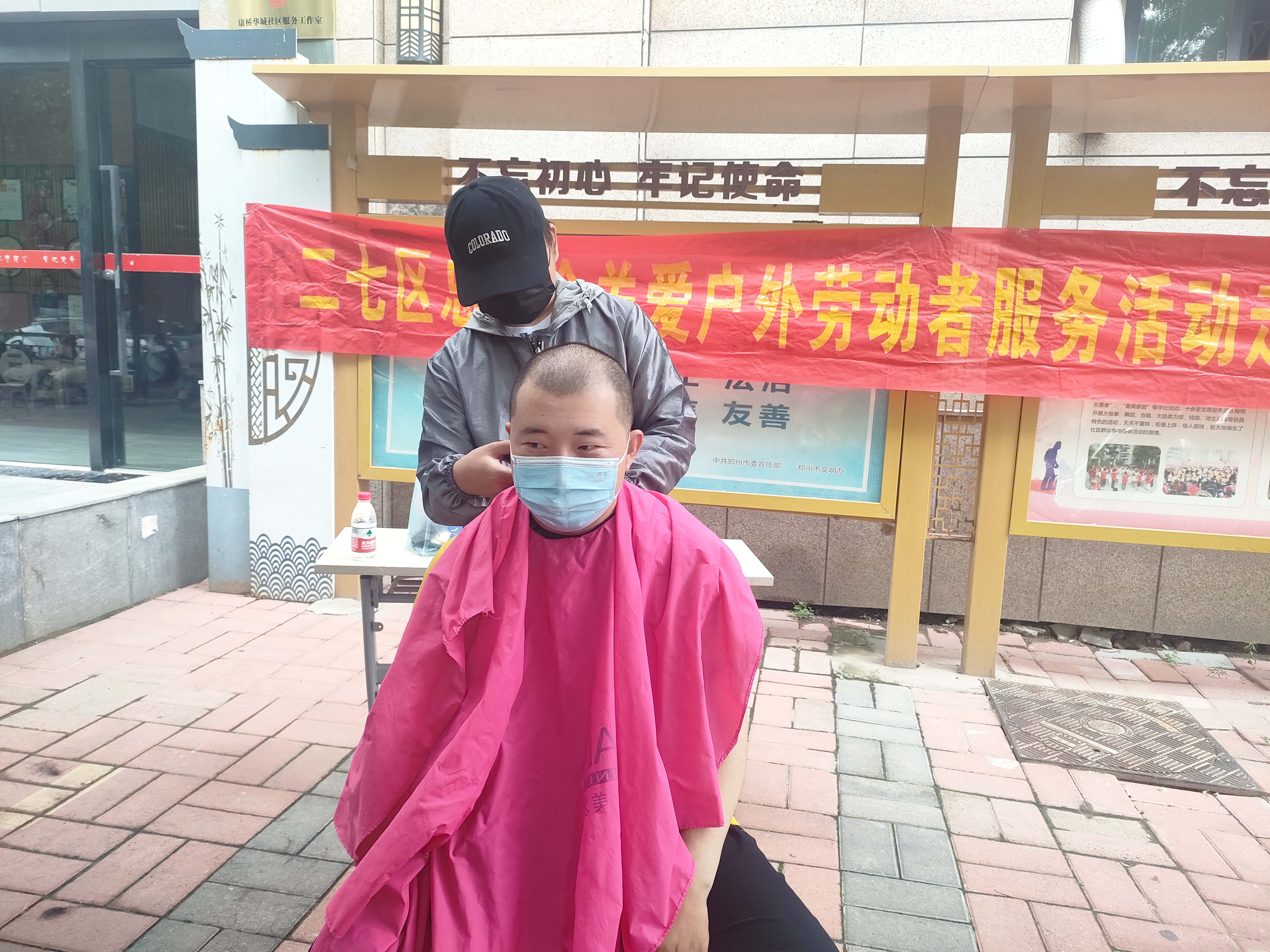 “帮我两边的头发理短一些,剪个寸头。”“好的,没问题。”……在康桥社区门口,理发小哥早早到达指定地点,摆好桌椅和理发用具,一丝不苟的为户外劳动者理发,手中的理发剪熟练的上下翻飞,片刻就剪出了他们满意的发型,并将对方耳后、脖子上的碎发清理干净。热情周到的服务和娴熟的理发技巧,赢得了大家的一致赞誉。端午节来临之际,职工志愿者和理发小哥也为大家送上端午节祝福。