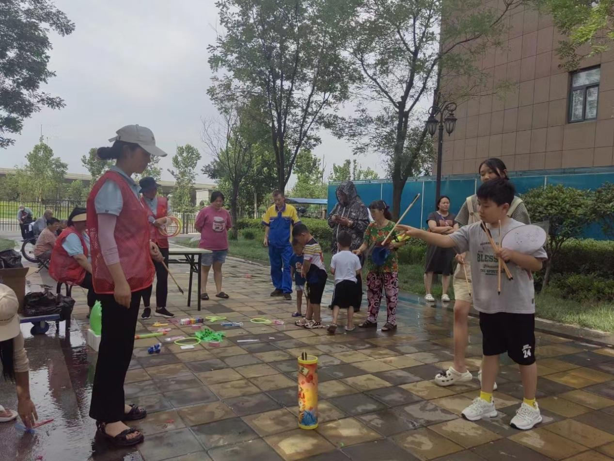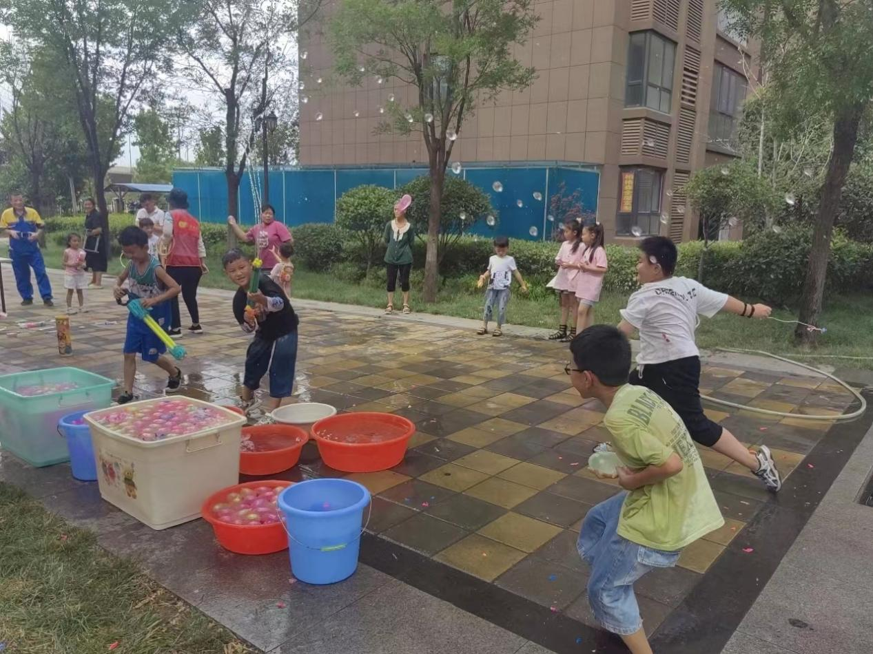 游戏环节中,小朋友们热情高涨,勇敢挑战趣味投壶游戏,瞄准壶口、找好角度、精准投壶;套圈圈游戏中,小朋友目标明确,紧盯心仪的小礼品,掷出手中的圈圈。最受欢迎的还要数水球大战,一个个水球、一支支水枪“火力全开”,孩子们跑着、玩着、躲闪着,在打水仗中加深了他们之间的感情,不亦乐乎。当每一个人身上被来自四面八方的水柱淋湿以后,尖叫声、欢呼声、呐喊声,此起彼伏,社区变成了欢乐的海洋。