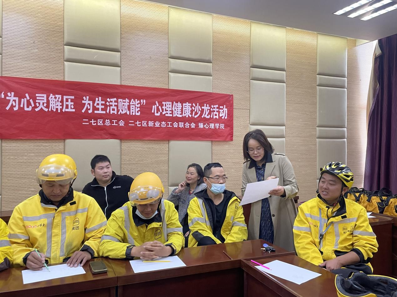 为做好新业态劳动者群体的关怀服务,帮助其树立积极健康的生活态度,10月19日上午,二七区总工会联合二七区新业态工会联合会开展新业态劳动者群体心理健康辅导沙龙活动,邀请瑧心理学院咨询师杨兵老师为20余名外卖骑手送上心理辅导。