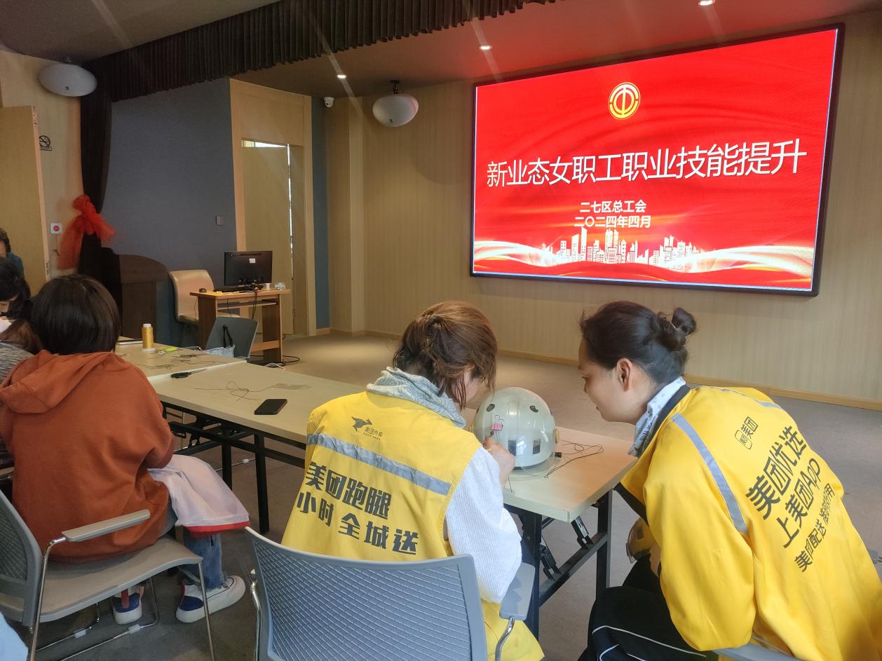 4月12日下午,由二七区总工会举办的“关爱女性骑手手工技能培训”活动在大学路街道长城社区举行,共有30余名外卖女骑手参加。