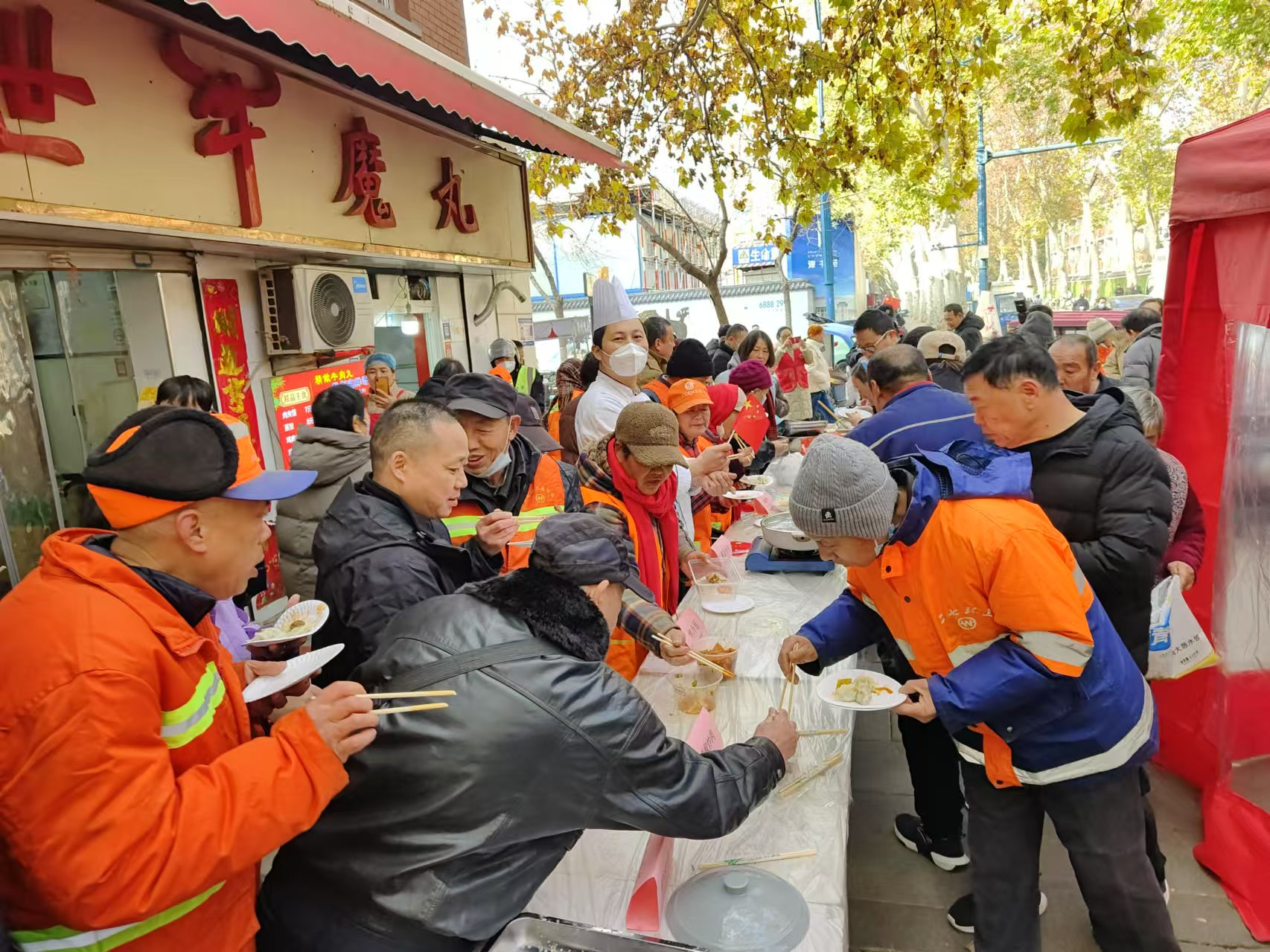 为了弘扬中华优秀传统文化,激发职工及新业态劳动者的文化自信,增进职工之间感情、拉近职工之间距离。二七区总工会、大学路街道工会于12月20日联合桃源社区雷锋帮帮团公益组织、康桥悦生活服务集团有限公司、光明传媒(河南)集团有限公司等10余家公益组织、爱心企业、医疗机构,在街道“共享职工之家”举办以“美味厨艺大比拼,义诊义剪暖人心”为主题的百人“饺子宴”活动。
