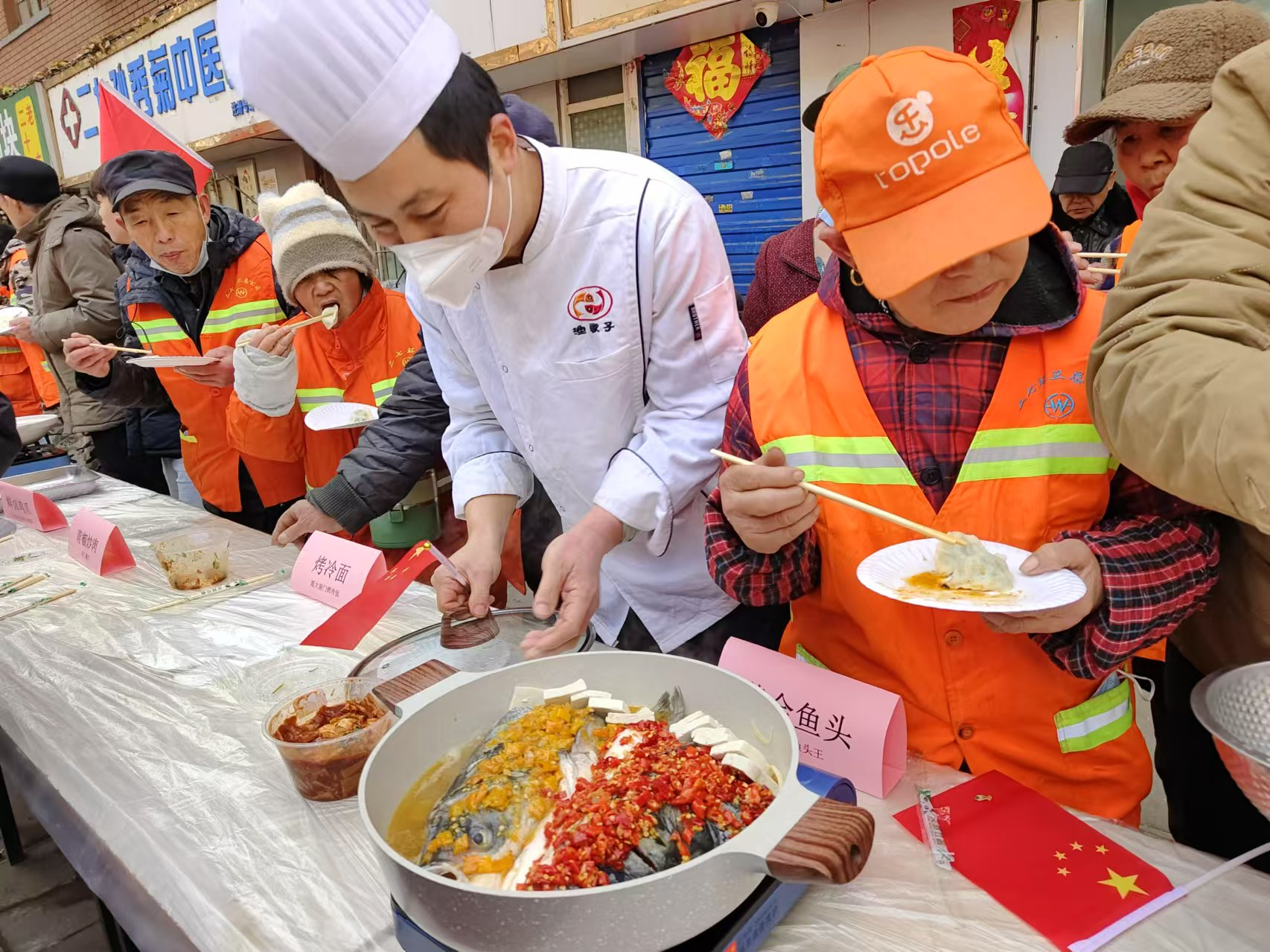 欢声笑语乐开怀。为了增加此次活动的趣味性,满足职工群众及新业态劳动者的“味蕾和胃蕾”,街道工会积极链接辖区餐饮商户,特别设立了“美食品鉴专区”,并增设了美食品鉴评选环节。辖区内多家知名餐饮商家纷纷亮出自家招牌,如“杭帮菜”莫山小馆的东坡枣香扎肉,“川菜”代表渔歌子鱼头王的黄金鱼头、藤椒鸡,焱合今日卤市的五香猪头肉、黑鸭卤鸭头、鸭脖等各类特色美食,琳琅满目,宛如一桌丰盛的“满汉全席”。职工们一边品尝着亲手包的饺子,一边细细品鉴各式美食,提出宝贵建议,现场氛围温馨而和谐。最终,渔歌子鱼头王的黄金鱼头和莫山小馆的东坡枣香扎肉凭借其独特风味赢得了“最受欢迎舌尖菜品”的美誉。