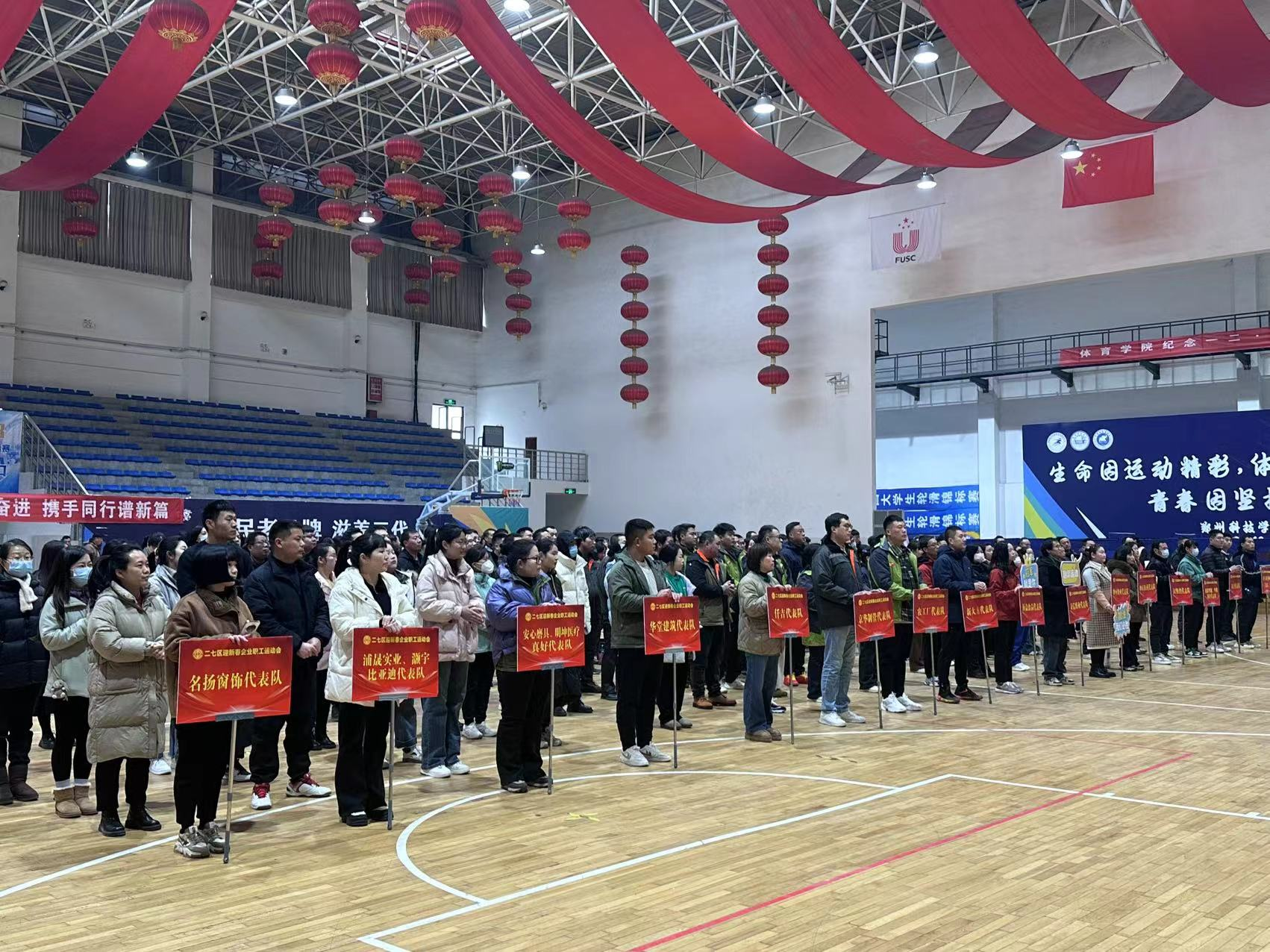 1月2日,在郑州科技学院体育场馆内人声鼎沸,由二七区总工会、二七经开区管委会、马寨镇人民政府联合举办的“政企联欢,拼搏奋进,共创未来”企业职工运动会在此盛大开幕。来自二七经开区新大方重工科技集团、京华制管有限公司、顶益食品有限公司、名扬窗饰有限公司等22家企业200多名职工齐聚一堂,共同参与了拔河、羽毛球、篮球、跳绳、乒乓球等5个项目的精彩角逐。区人大党组成员、副主任,区总工会主席刘子科;马寨镇人民政府党委书记贾新建;区总工会党组书记、常务副主席霍晓丽;二七经开区党工委书记、管委会主任陈卫东出席开幕式。