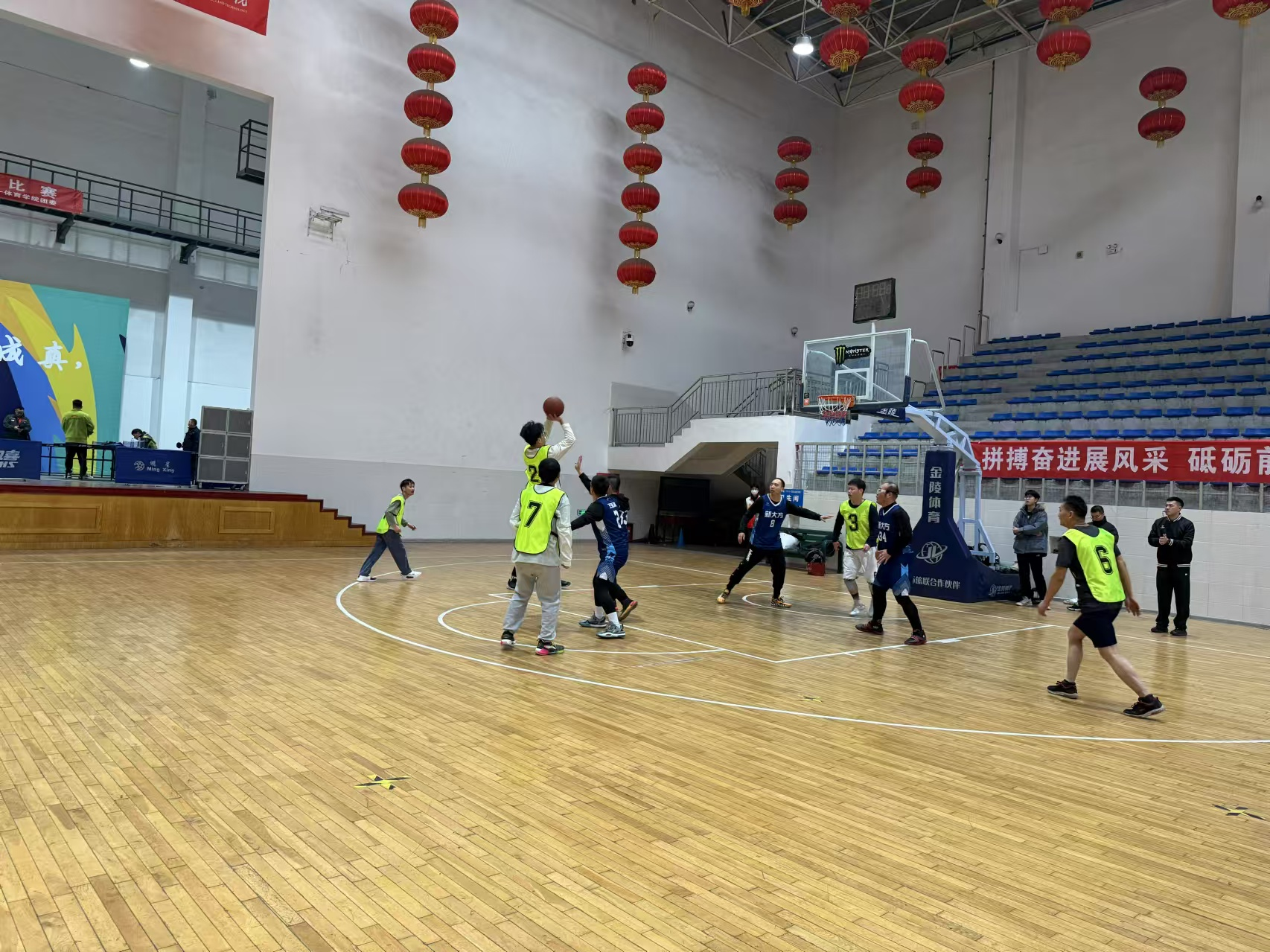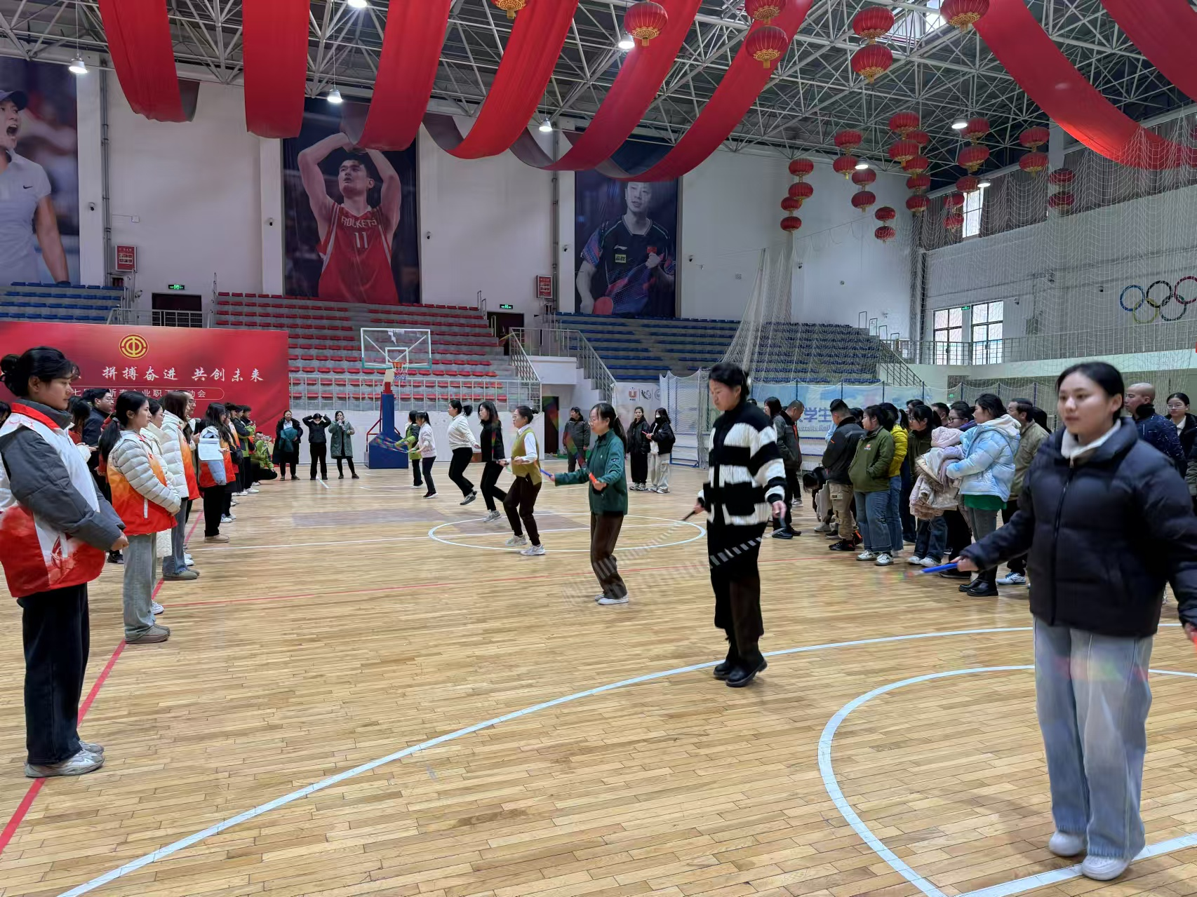 尽管正值寒冬时节,但运动员们的热情却丝毫未减。拔河队员们步步为营,拼尽全力争夺每一分每一毫的胜利;羽毛球场上,运动员们蓄力拍击,打出一道道优美而又凌厉的弧线,引得观众们时而屏气凝神,时而高呼精彩;篮球馆内,攻守频易,队员们闪转腾挪、踊跃投篮,欢呼声此起彼伏,将比赛氛围推向了高潮。跳绳与乒乓球的比赛同样精彩纷呈,运动员们身姿矫健、技艺精湛,尽展青春风采。