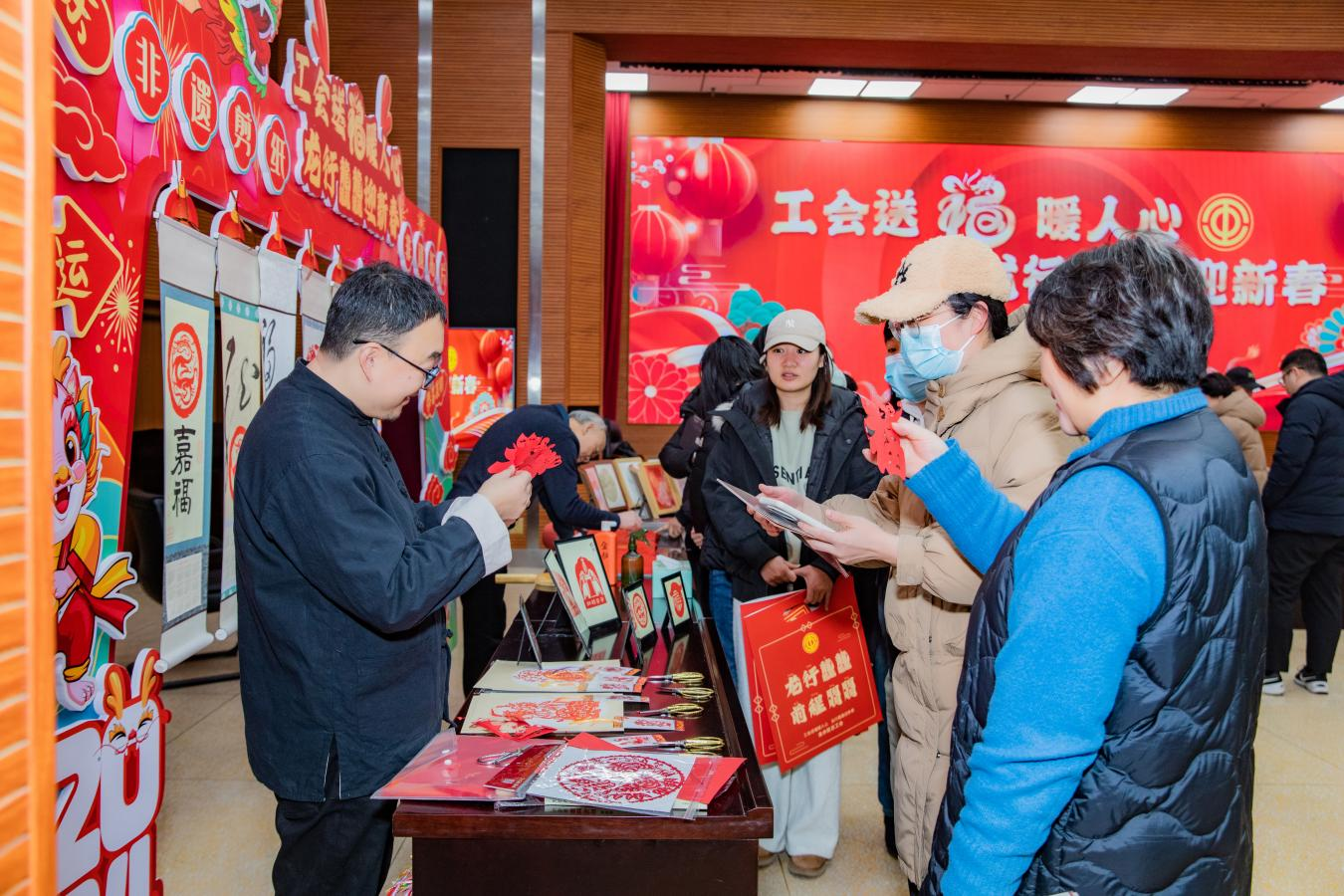 在区机关主会场,非遗剪纸、拓印制作区域气氛活跃,职工们在老师指导下体验剪纸、拓印,感受非遗文化的独特魅力。在金水工会文化路街道驿站分会场,一副副苍劲有力的精美春联和一张张圆润饱满的“福”字,在书法家行云流水下一气呵成,满载着工会“娘家人”的美好祝福跃然纸上。外卖员、环卫工人等户外劳动者手捧吉祥喜庆的“年味儿”艺术品满载而归,喜悦之情溢于言表。