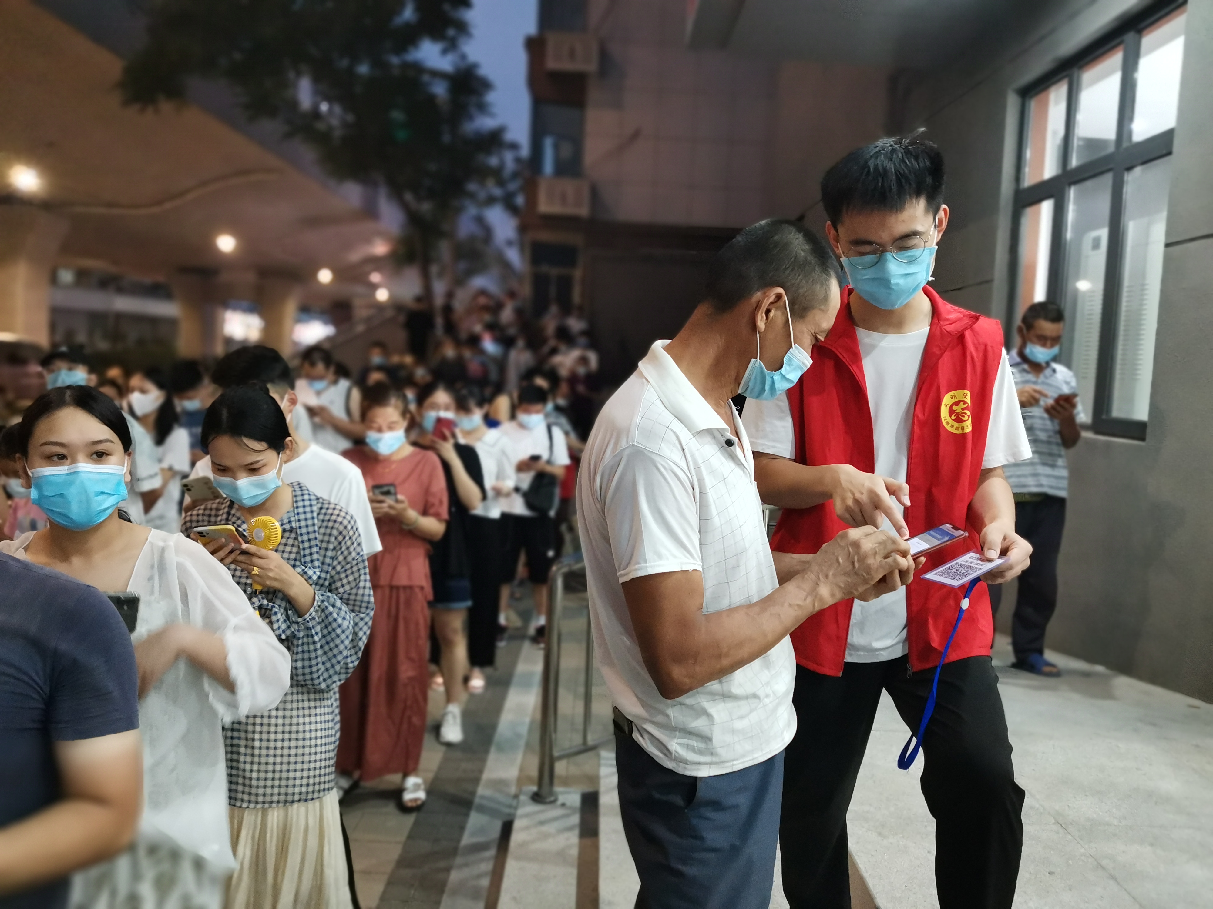 同时,盛伟要求工会下沉人员积极配合社区及医护人员开展工作,引导群众间隔1米有序排队,协助做好二维码登记答疑解惑,安抚群众情绪,现场核酸检测井然有序地进行。与时间赛跑,与病毒战斗,工会的同志整夜坚守岗位,全力为前来做核酸检测的群众做好指引服务工作。