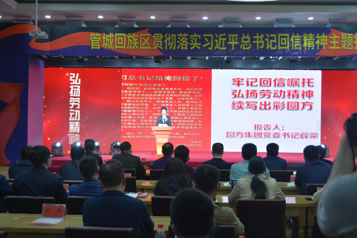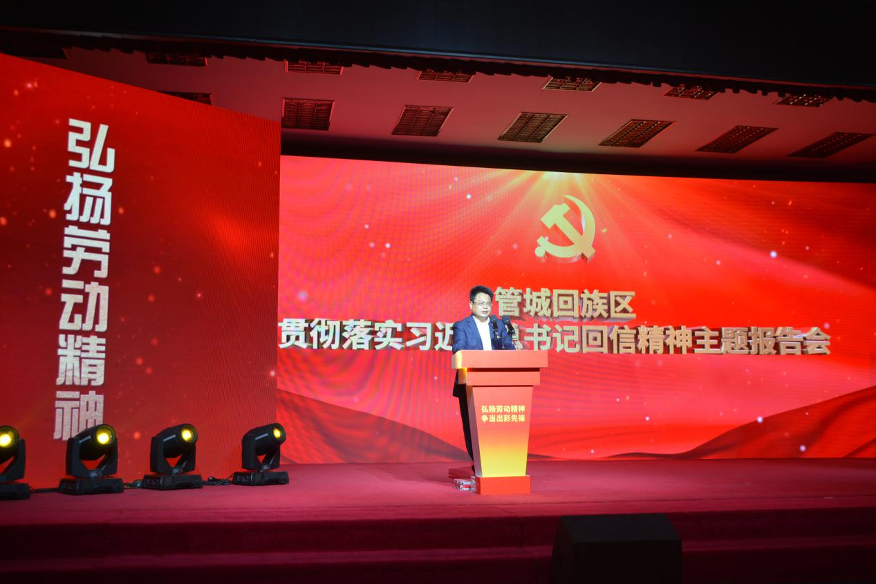 在习近平总书记给圆方集团回信一周年之计,4月29日上午,管城回族区隆重召开贯彻落实习近平总书记回信精神主题报告会。区领导刘利、杨洁、姚方海、刘宁、李勇、孙涵、盛伟出席会议,市总工会党组成员、副主席杜建新受邀参加,报告会由区总工会承办。