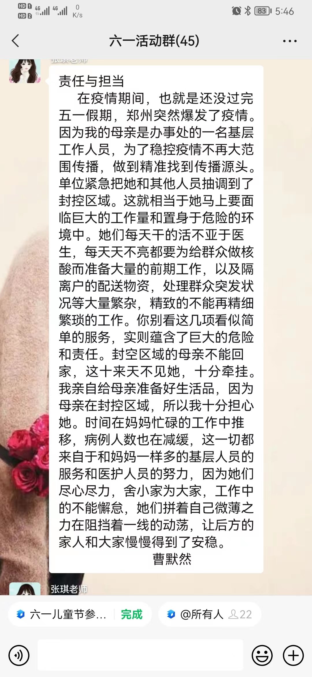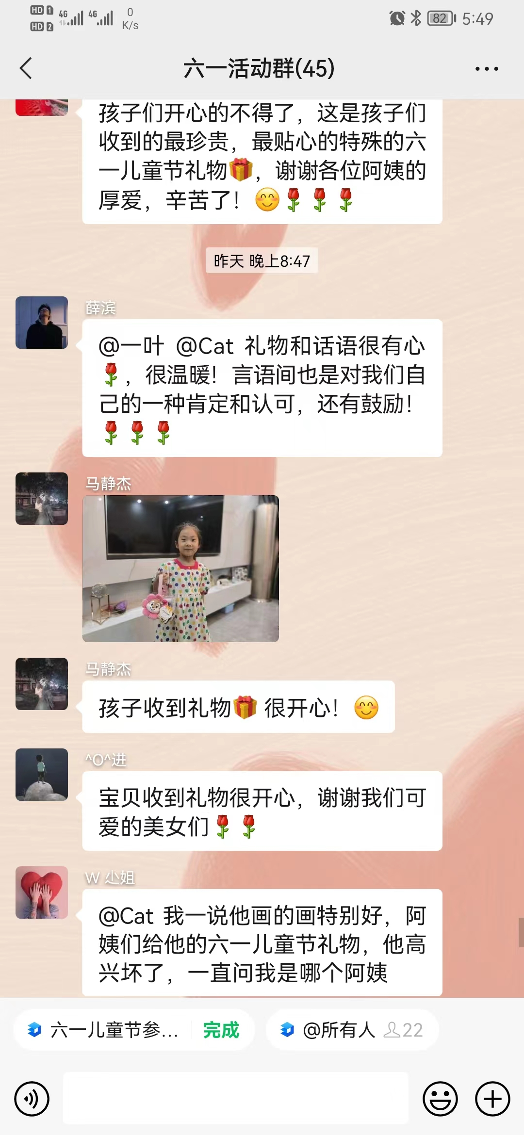 街道工会组织全体职工5到14岁的孩子,参加儿童节线上活动,在5月25日到5月30日间,孩子们以绘画、诗歌、小说、散文、手抄报等多种形式描绘出自己心中的爸爸妈妈,将作品在微信群中展示。6月1日,职工们替儿童领取街道工会为孩子们精心准备的小礼物,孩子们收到礼物非常开心,在群里表达他们的喜悦和感谢。