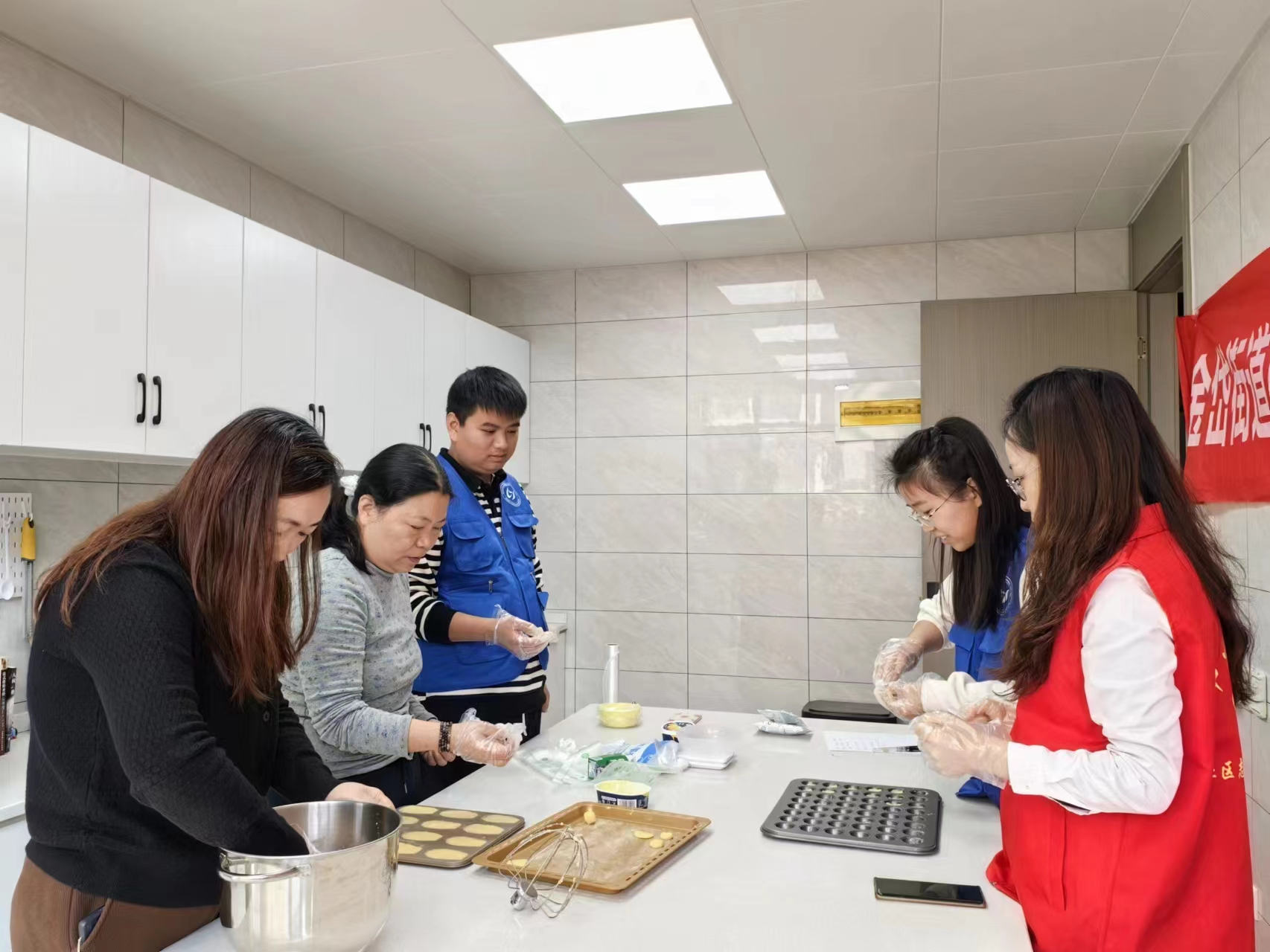 烘焙老师首先对烘焙工具的使用、配料的比例、制作方法等进行讲解和操作演示。随后,在工作人员的细心指导下,现场职工群众相互学习交流、配合默契,学会曲奇饼干、纸杯蛋糕、肉松小贝、蛋糕卷、烧仙草的烘焙制作方法。大家在感受手工烘焙的乐趣的同时,掌握了基本烘焙技能,增进彼此间的交流。
