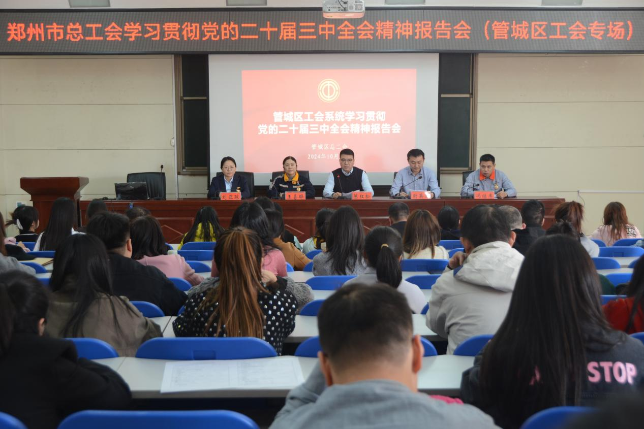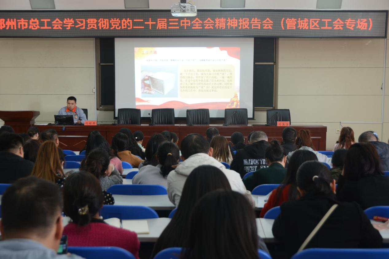 10月23日下午,郑州市总工会学习贯彻党的二十届三中全会精神报告会(管城区工会专场)圆满举办,来自全区各基层工会的近200名干部职工参加会议。