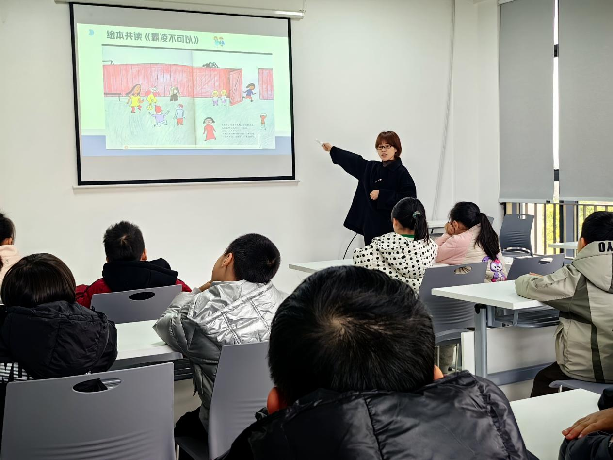活动伊始,志愿者带领孩子们跳起充满活力的热身律动操,营造轻松愉悦的氛围。随后,志愿者通过精心制作的PPT,围绕什么是校园欺凌、表现形式、危害以及应对方法等内容进行了详细讲解。在绘本共读环节《霸凌不可以》中,孩子们清晰地认识到,蓄意或恶意地通过肢体、语言、网络等手段进行欺负、侮辱并造成伤害的行为都属于校园欺凌。志愿者引导孩子们建立正确的人际关系观念,遭遇校园欺凌时,应增强自我保护意识,第一时间主动向家长、学校和社区求助,要勇敢地运用法律武器维护自身合法权益。
