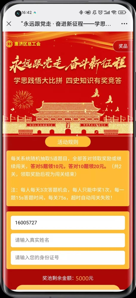 活动共投放现金5000元,活动期间,每人每天有3次闯关机会,每人最多可中奖1次,奖金全部发完后,活动截止!