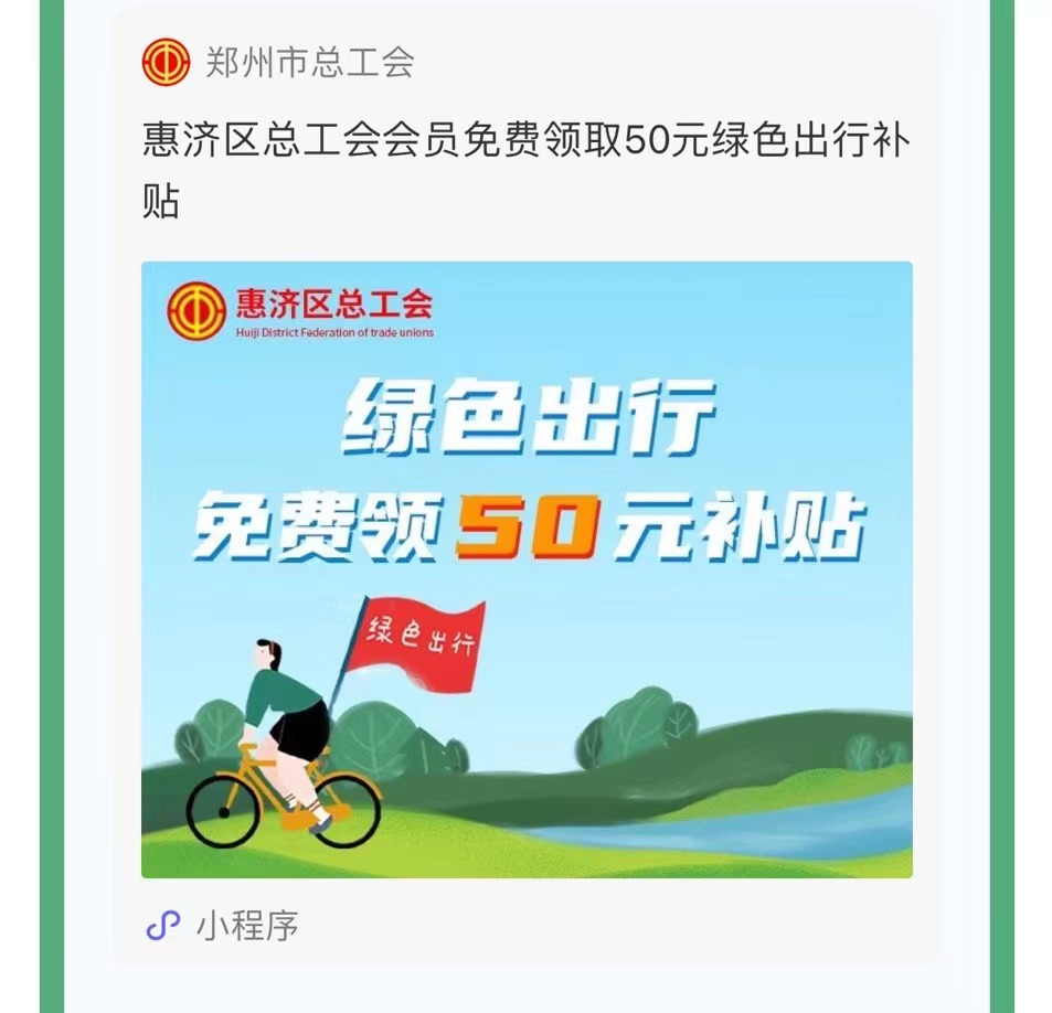 工会会员在活动期内通过微信平台申报个人信息,即可获得50元绿色出行补贴,惠济区总工会将在活动结束1个月内通过郑州银行转账方式将补贴直接转入会员工会卡金融账户内,每人限申报一次。