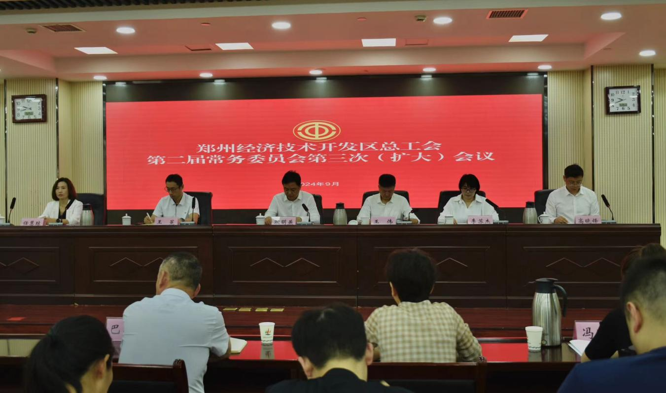 9月25日,郑州经济技术开发区总工会第二届常务委员会第三次(扩大)会议召开,学习传达贯彻党的二十届三中全会《公报》、《决定》,全国人大常委会副委员长、中华全国总工会主席王东明在豫调研讲话精神和郑州市总工会第十五届常务委员会第二次(扩大)会议精神,总结今年以来的工作,研究部署下一步工作。区人大工委副主任、总工会主席耿明燕主持会议并讲话。区党群工作部副部长、总工会副主席王伟作工作报告。