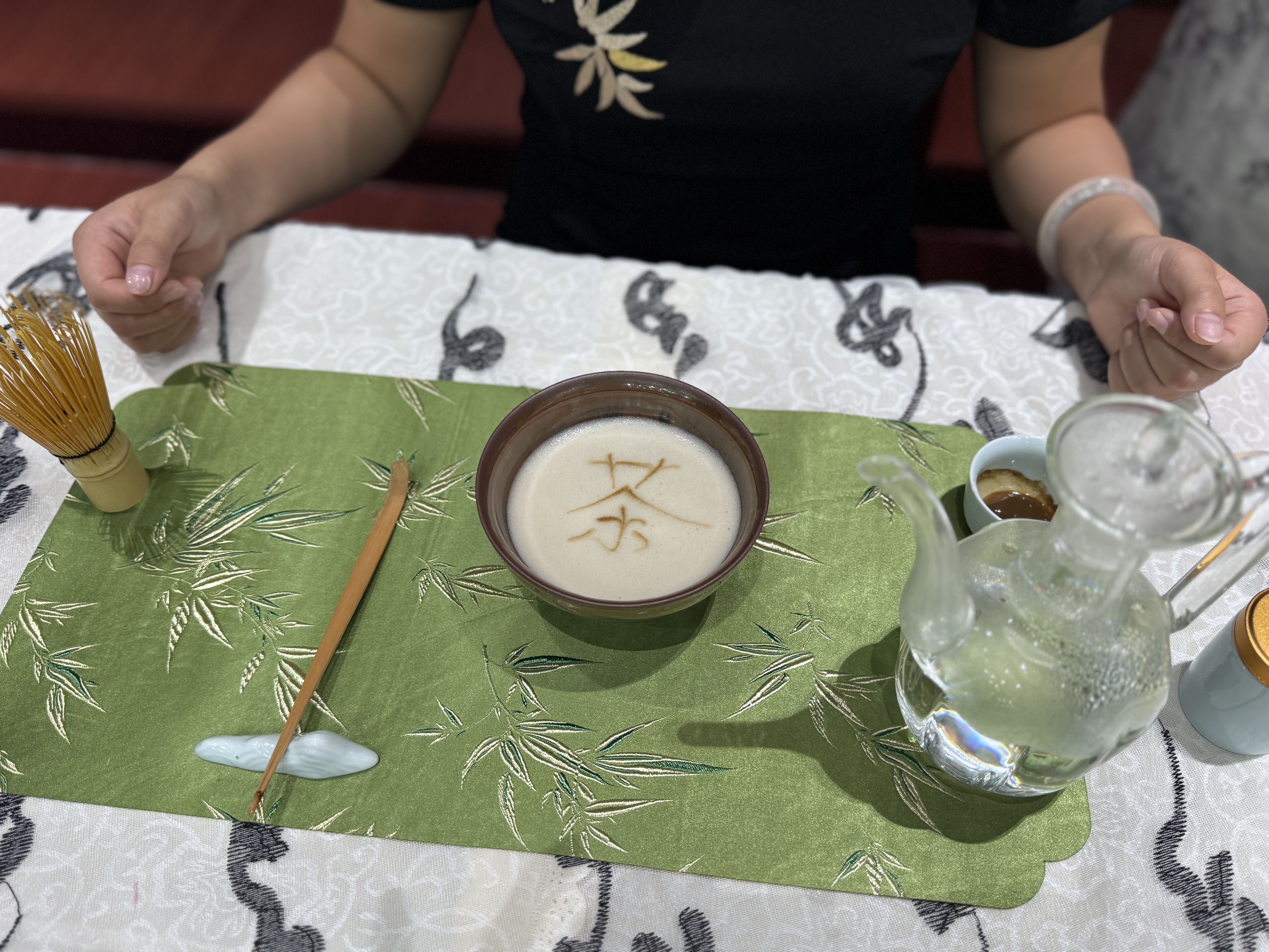在实践互动环节,职工们分组实操,手持茶筅在建盏中反复击拂,从茶汤“疏星淡月”到“乳面凝香”,在一次次尝试中感受宋式点茶的精妙。活动还创新设置“七夕茶百戏”体验,职工们用茶粉在茶汤表面勾勒出鹊桥、牛郎织女等图案,或书写美好寄语,让传统技艺与节日浪漫深度融合。现场还穿插了宋代茶诗赏析、茶礼知识问答等环节,进一步加深了职工对宋茶文化的理解。