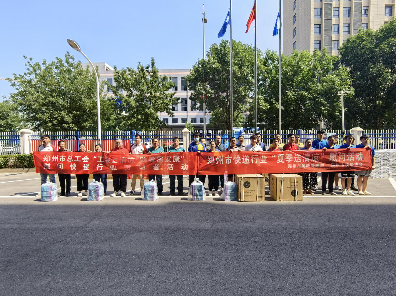 7月26日上午,市总工会联合市邮政管理局、市快递行业工会联合会共同开展2023年“送清凉”慰问活动。市邮政管理局副局长周坤,市总工会法律工作部部长陈阳带领部门工作人员及律师团队、市新就业形态工会工作人员、市快递行业协会副秘书长李计文在中牟县中通物流园区,为忙碌在一线的新业态劳动者们送去一声问候、一缕清凉、一片暖心、一份安心。