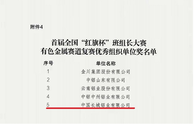 近日,首届全国“红旗杯”班组长大赛有色金属赛道复赛暨2024年“中国铜业杯”全国有色金属行业班组长综合管理技能竞赛在内蒙古赤峰市圆满闭幕,公司在此次竞赛中荣获优秀组织单位奖。