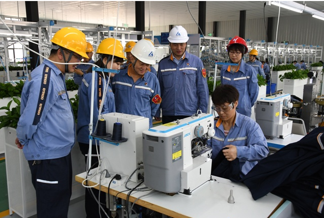 随后,高纯生、石亚飞到顾海军劳模创新工作室和智能化服装生产线进行了检查指导,详细了解了工作室基础设施配置情况、特殊材料在劳动保护用品的应用情况、服装生产线智能化设备的使用情况和人员配置情况。