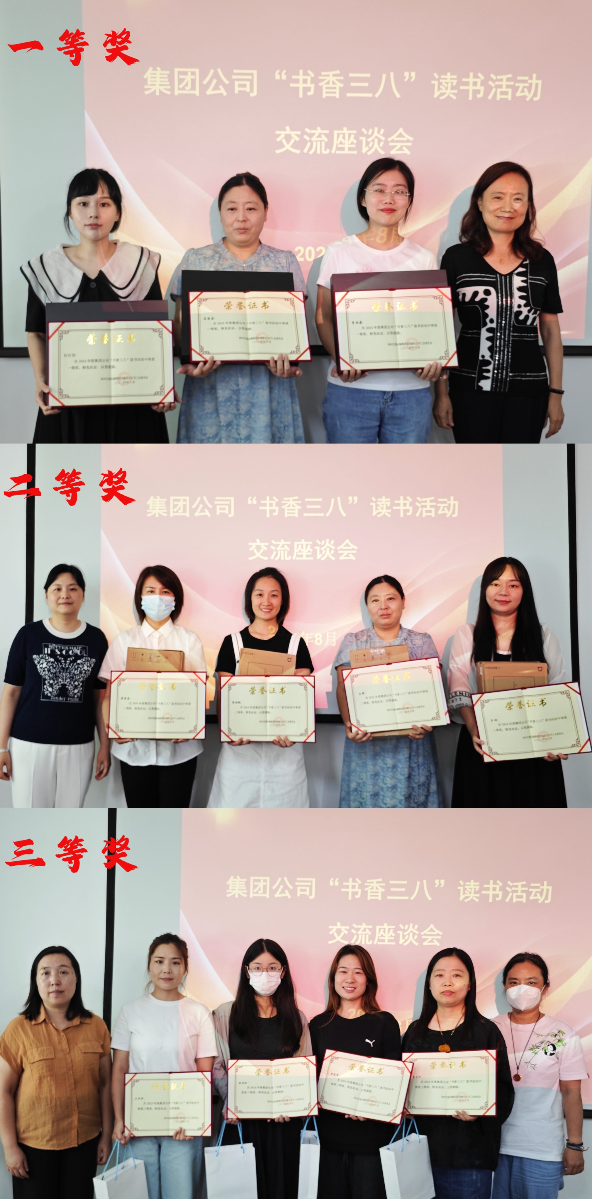 经集团公司女工委认真评审,有11名同志获奖,其中公铁联运公司马茜茜、机关李林蔚、耿皎珺荣获一等奖,中心站周旌飘、危险品运输公司王娜、机关雍圆圆、王琳荣获二等奖,金象物流张思璐、中原大厦贺雅倩、新密公司王亚歌、机关孟令冲荣获三等奖。会上为获奖者颁发证书并合影留念。