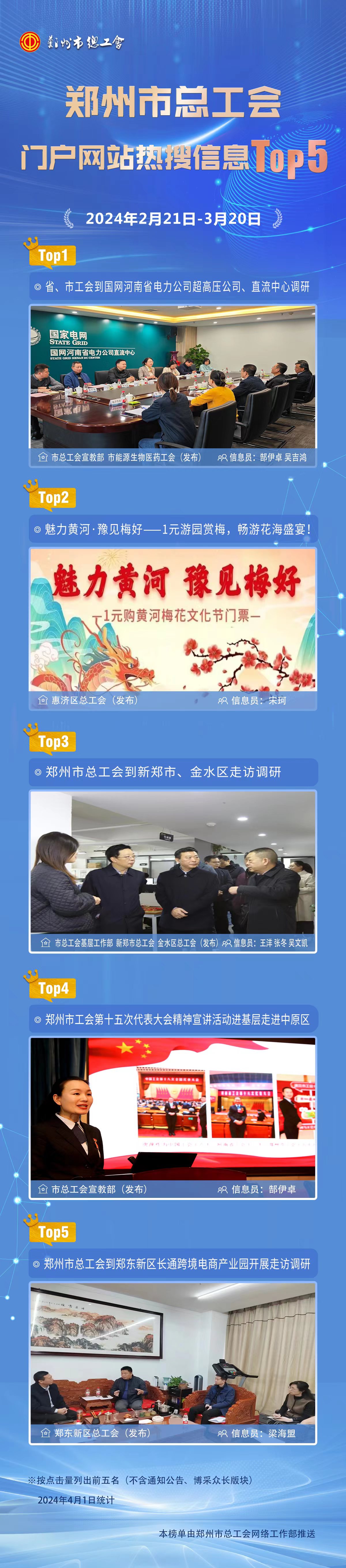 为深入贯彻落实市工会十五大精神,切实把工会网站建设成为宣传工会的平台、交流工作的载体、服务职工的阵地,市总工会持续强化门户网站各项运行机制,网站内容更新率、上传信息点击量、职工需求契合度不断提升。为进一步激发全市工会系统关注、支持、参与网站建设,更好地服务工会整体工作,市总连续推出“门户网站月度热搜信息Top5”。现将市总门户网站2024年2月21日—2024年3月20日热搜信息Top5推送如下: