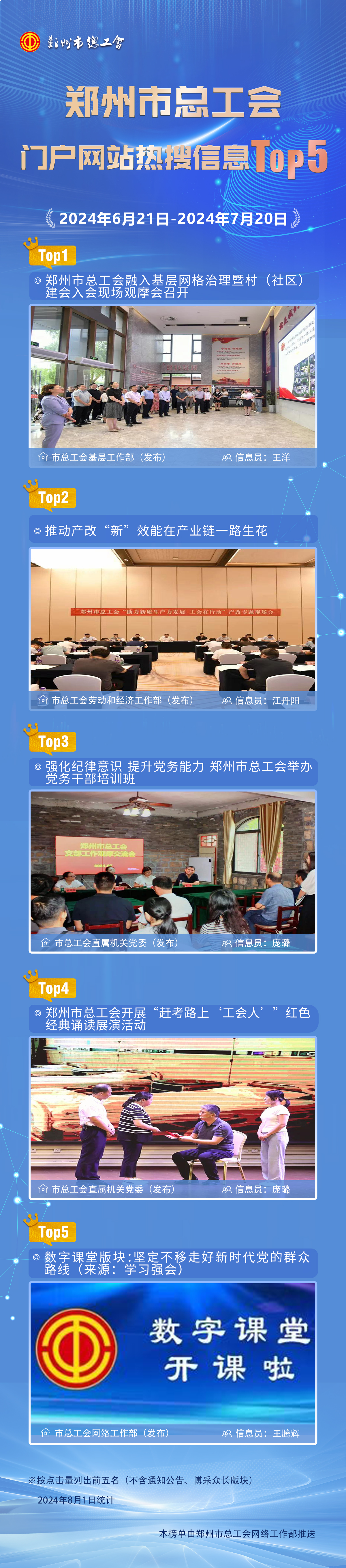 为深入贯彻落实市工会十五大精神,切实把工会网站建设成为宣传工会的平台、交流工作的载体、服务职工的阵地,市总工会持续强化门户网站各项运行机制,网站内容更新率、上传信息点击量、职工需求契合度不断提升。为进一步激发全市工会系统关注、支持、参与网站建设,更好地服务工会整体工作,市总连续推出“门户网站月度热搜信息Top5”。现将市总门户网站2024年6月21日—2024年7月20日热搜信息Top5推送如下: