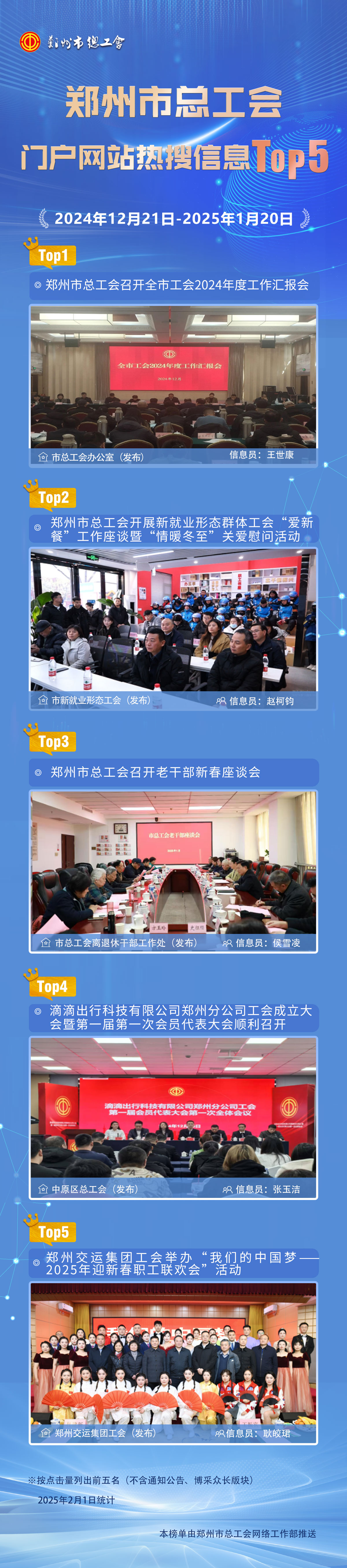 为深入贯彻落实市工会十五大精神,切实把工会网站建设成为宣传工会的平台、交流工作的载体、服务职工的阵地,市总工会持续强化门户网站各项运行机制,网站内容更新率、上传信息点击量、职工需求契合度不断提升。为进一步激发全市工会系统关注、支持、参与网站建设,更好地服务工会整体工作,市总连续推出“门户网站月度热搜信息Top5”。现将市总门户网站2024年12月21日—2025年1月20日热搜信息Top5推送如下: