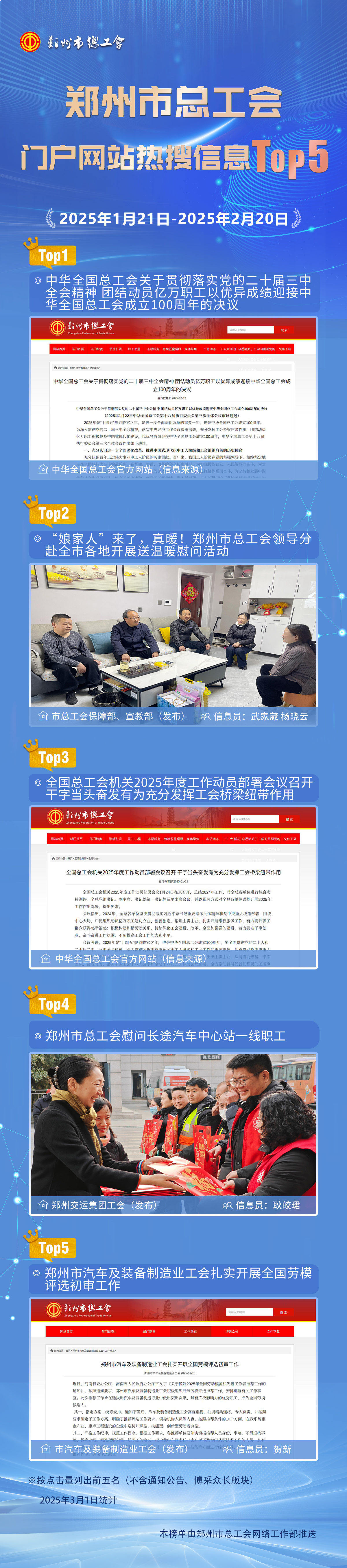 为深入贯彻落实市工会十五大精神,切实把工会网站建设成为宣传工会的平台、交流工作的载体、服务职工的阵地,市总工会持续强化门户网站各项运行机制,网站内容更新率、上传信息点击量、职工需求契合度不断提升。为进一步激发全市工会系统关注、支持、参与网站建设,更好地服务工会整体工作,市总连续推出“门户网站月度热搜信息Top5”。现将市总门户网站2025年1月21日—2025年2月20日热搜信息Top5推送如下: