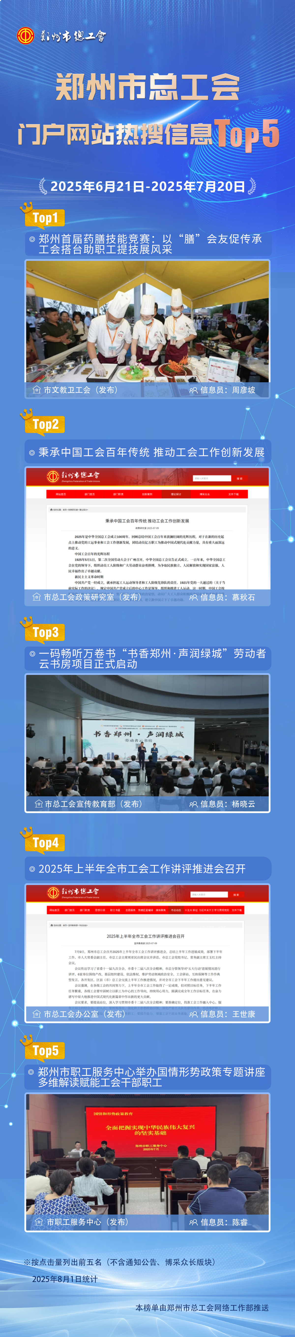 为深入贯彻落实市工会十五大精神,切实把工会网站建设成为宣传工会的平台、交流工作的载体、服务职工的阵地,市总工会持续强化门户网站各项运行机制,网站内容更新率、上传信息点击量、职工需求契合度不断提升。为进一步激发全市工会系统关注、支持、参与网站建设,更好地服务工会整体工作,市总连续推出“门户网站月度热搜信息Top5”。现将市总门户网站2025年6月21日—2025年7月20日热搜信息Top5推送如下: