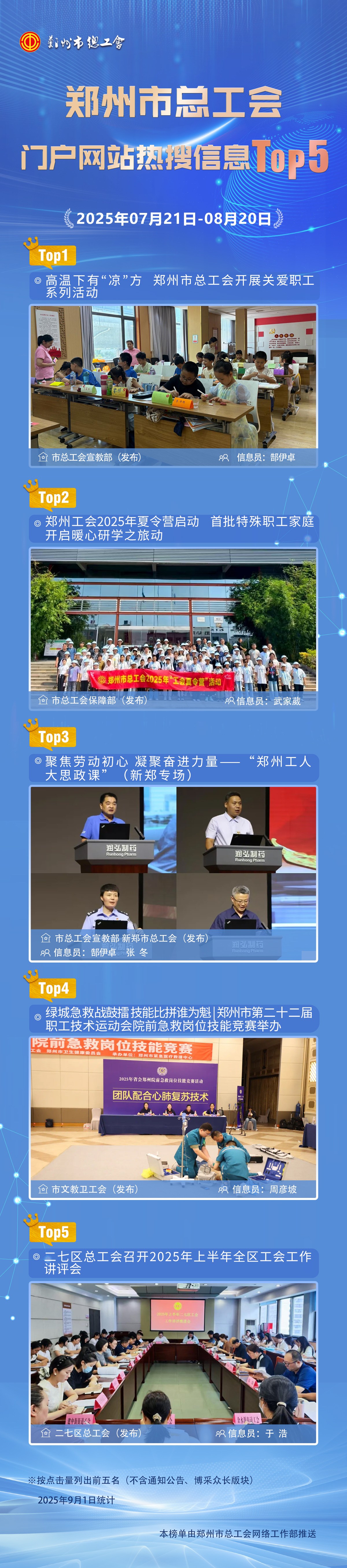 为深入贯彻落实市工会十五大精神,切实把工会网站建设成为宣传工会的平台、交流工作的载体、服务职工的阵地,市总工会持续强化门户网站各项运行机制,网站内容更新率、上传信息点击量、职工需求契合度不断提升。为进一步激发全市工会系统关注、支持、参与网站建设,更好地服务工会整体工作,市总连续推出“门户网站月度热搜信息Top5”。现将市总门户网站2025年7月21日—2025年8月20日热搜信息Top5推送如下: