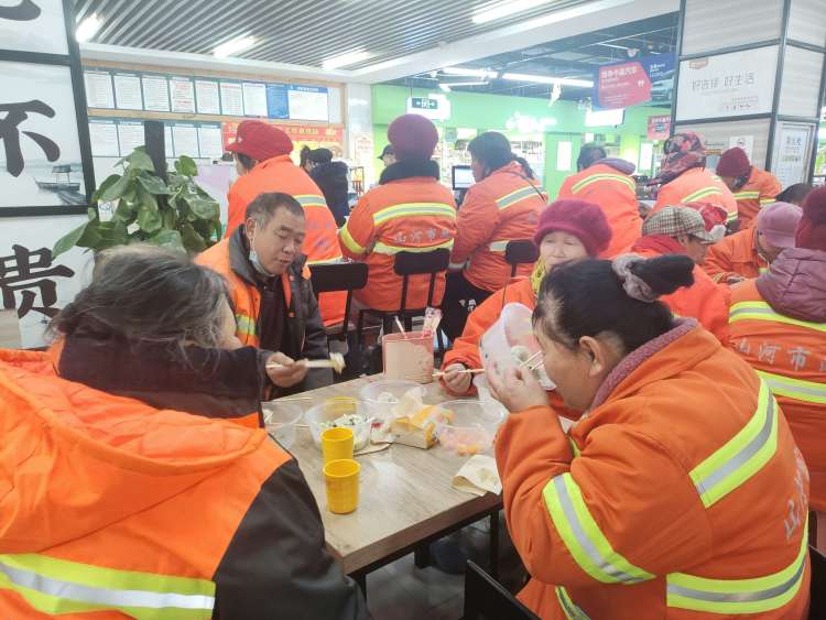 “饺子来喽!”金好来超市工作人员端来热气腾腾的饺子,端到环卫工面前,环卫大姐连连点头称赞:“今天的饺子个大馅儿满,有猪肉大葱的,也有羊肉馅儿的,吃了心里暖暖的。”忙活了一早的众人围坐在桌前品尝自己的劳动成果。