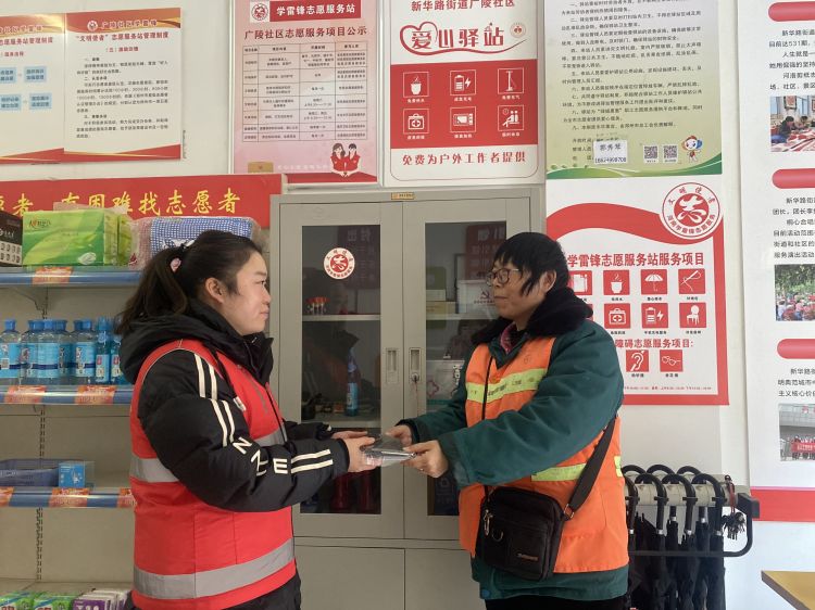 广陵社区暖心驿站工作人员在慰问现场为他们发放手套,亲切地为保洁员们送上关心与问候,对保洁员长期以来的辛勤付出和默默奉献表示感谢,同时,工作人员告诉环卫工们:“工会暖心驿站是专门为室外工作者打造的避风港,我们可以提供临时休息、手机充电和热水等服务,如有需要请尽管来找我们。”