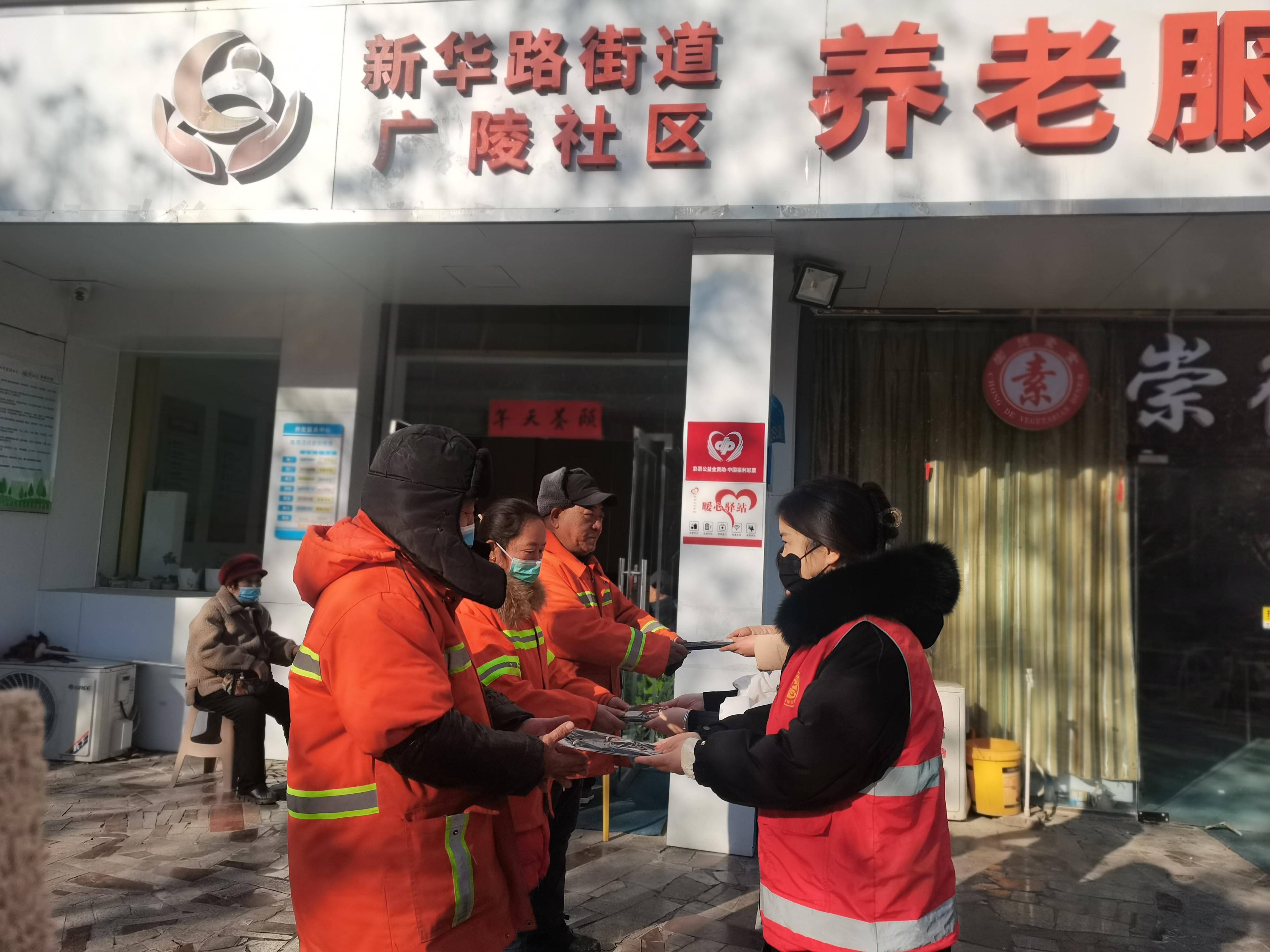 为了感恩环卫工为辖区环境卫生的辛勤劳动,2023年12月25日下午,新华路街道广陵社区暖心驿站开展“慰问环卫工、真情暖寒冬”慰问活动,以此来表达对他们的关心与尊重,让他们切实感受到社区的温暖和关怀。