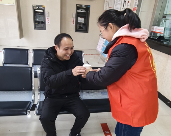 志愿者们对环户外劳动者们日复一日、年复一年不畏严寒穿梭在大街小巷,服务着千家万户表示感谢,欢迎他们多到驿站中歇歇脚、喝杯热水,叮嘱他们寒冬来袭、雨雪增多要注意安全和冬季防寒。