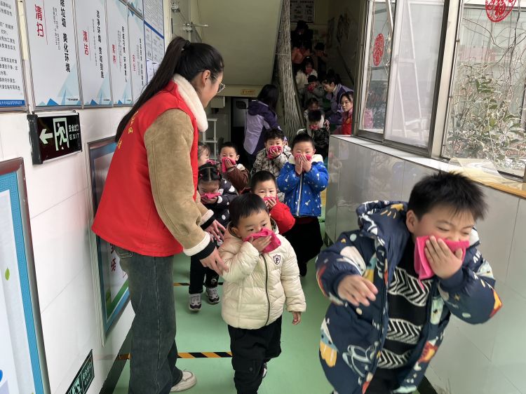 消防警铃响起,全体教职工立即停下手中的工作,孩子们在老师和职工志愿者的协助下,捂住口鼻,弯腰低身,按照逃生路线有序逃生。途中,孩子们冷静、有序、快速撤离。