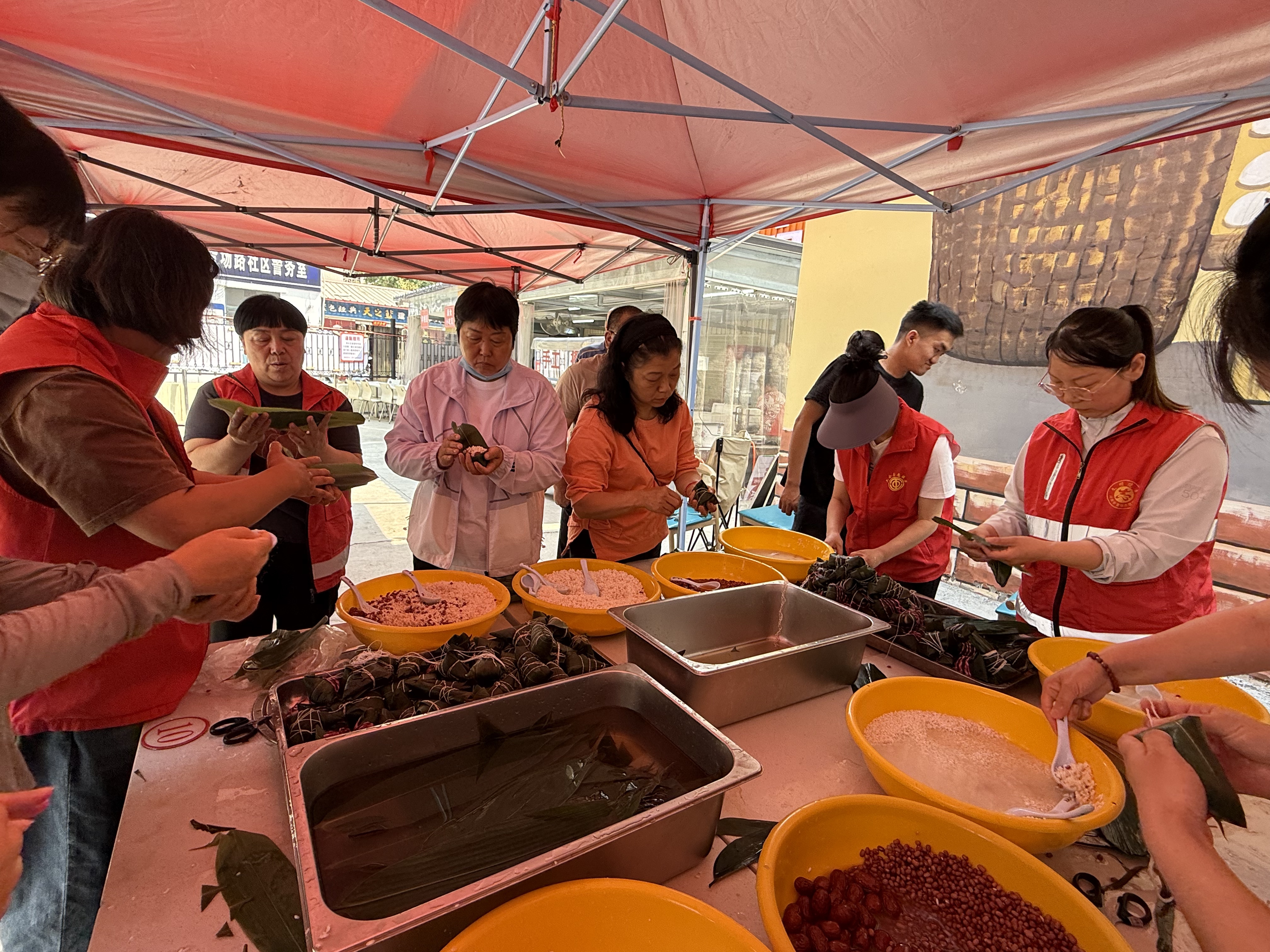 社区大食堂院内党员及网格员将提前泡好的粽叶、糯米、红豆、红枣等食物放入活动场地,“折粽叶、放糯米、红枣、红豆、裹粽叶、绑线……”个个动作娴熟,一起包粽子、话家常里短、聊工会暖心事,不一会儿粒粒糯米、红豆变成了一盘盘糯米粽。