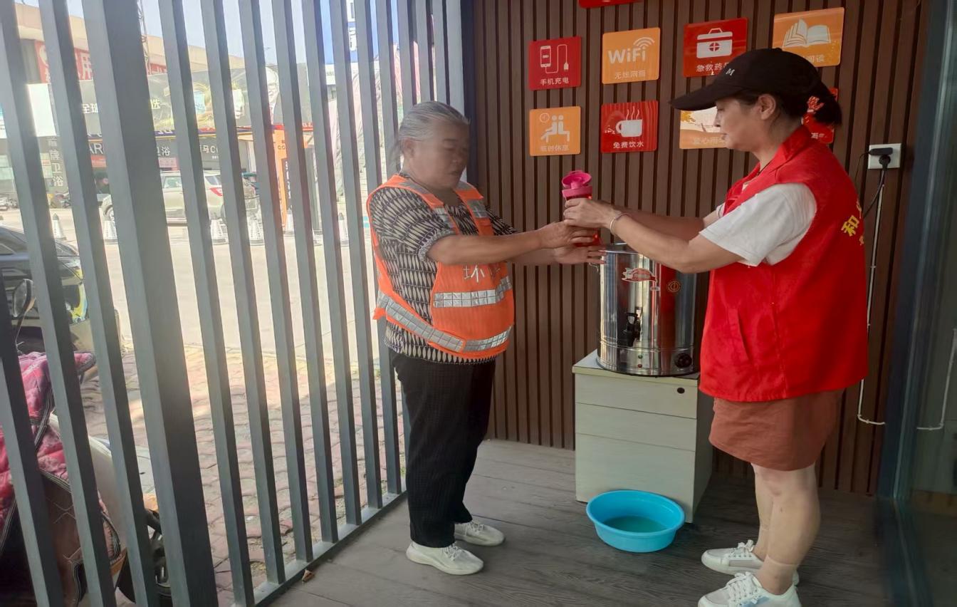 “大妈,您歇会儿再忙活!这绿豆水熬得稠稠的,解腻又解渴,凉好了搁这儿呢,随时过来续杯,别客气啊!”工作人员一边擦着额角的汗,一边笑着给刚清扫完街角的环卫大妈递过一杯冰镇绿豆水,又指着一旁的物资架说:“旁边还有风油精和小扇子,拿一个揣兜里,天热干活儿也能舒坦点。”