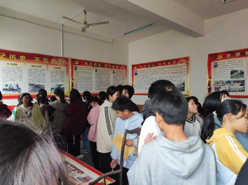 活动过程中师生们为纪念园中的三通碑献上了花篮,缅怀祭奠革命先烈。紧接着师生们有序的参观红色教育基地,翻阅杨岭村红色教育基地历史,看到了抗日战争历史的一角。红色教育基地的建成,离不开杨建华夫妇多年奔波劳碌,最后在多方支持下建成了如今的红色教育基地。基地不大的展览室陈列了百余件抗战时期的物品,其中不仅包括民兵队的大刀长矛、皮司令用过的煤油灯,还有当时使用的纺织机、纺线机。