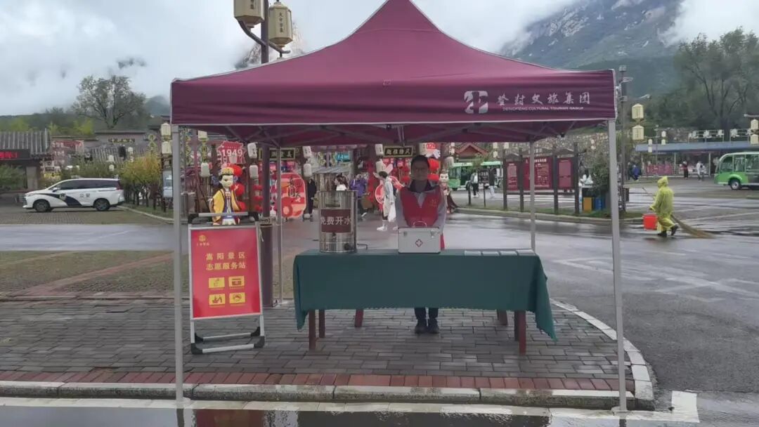 嵩阳景区工会驿站志愿者为游客提供游览咨询、寻人找物、免费开水、应急药包等服务。